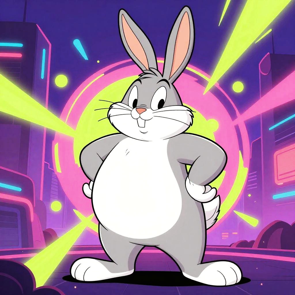 Lola Bunny fat, stylized cartoon rabbit with exaggerated curvy form, vibrant neon background, abstract shapes swirling around, futuristic urban scene, high contrast colors, playful and energetic composition, comic book influence