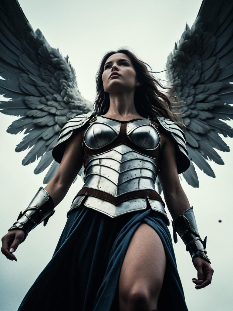 Low-angle cinematic realism photo of a woman wearing a warrior angel costume featuring large feathered wings, metallic armor chest plate, arm guards, and a flowing fabric skirt. The dramatic perspective emphasizes strength and determination.