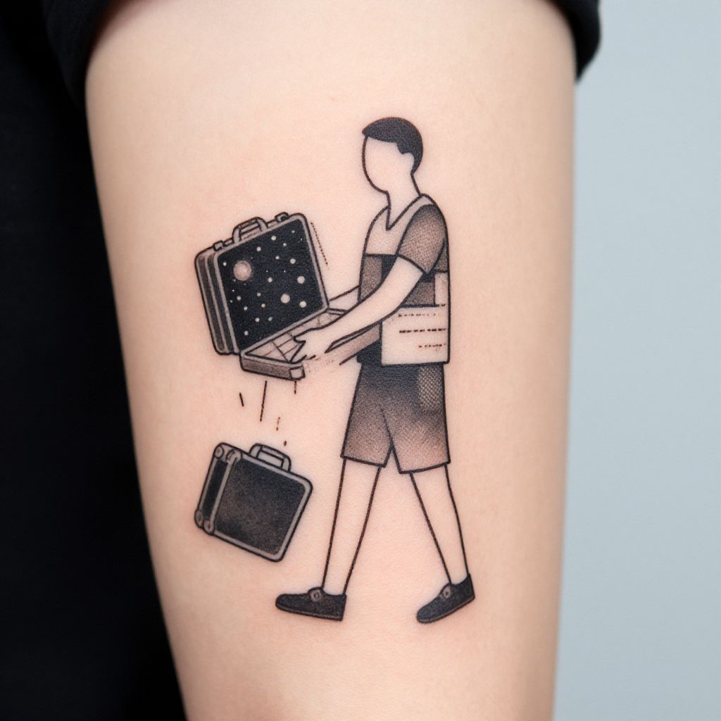 Black and white tattoo of a faceless man in shorts and a shirt, carrying a starry suitcase, with another suitcase on the ground. Minimalist