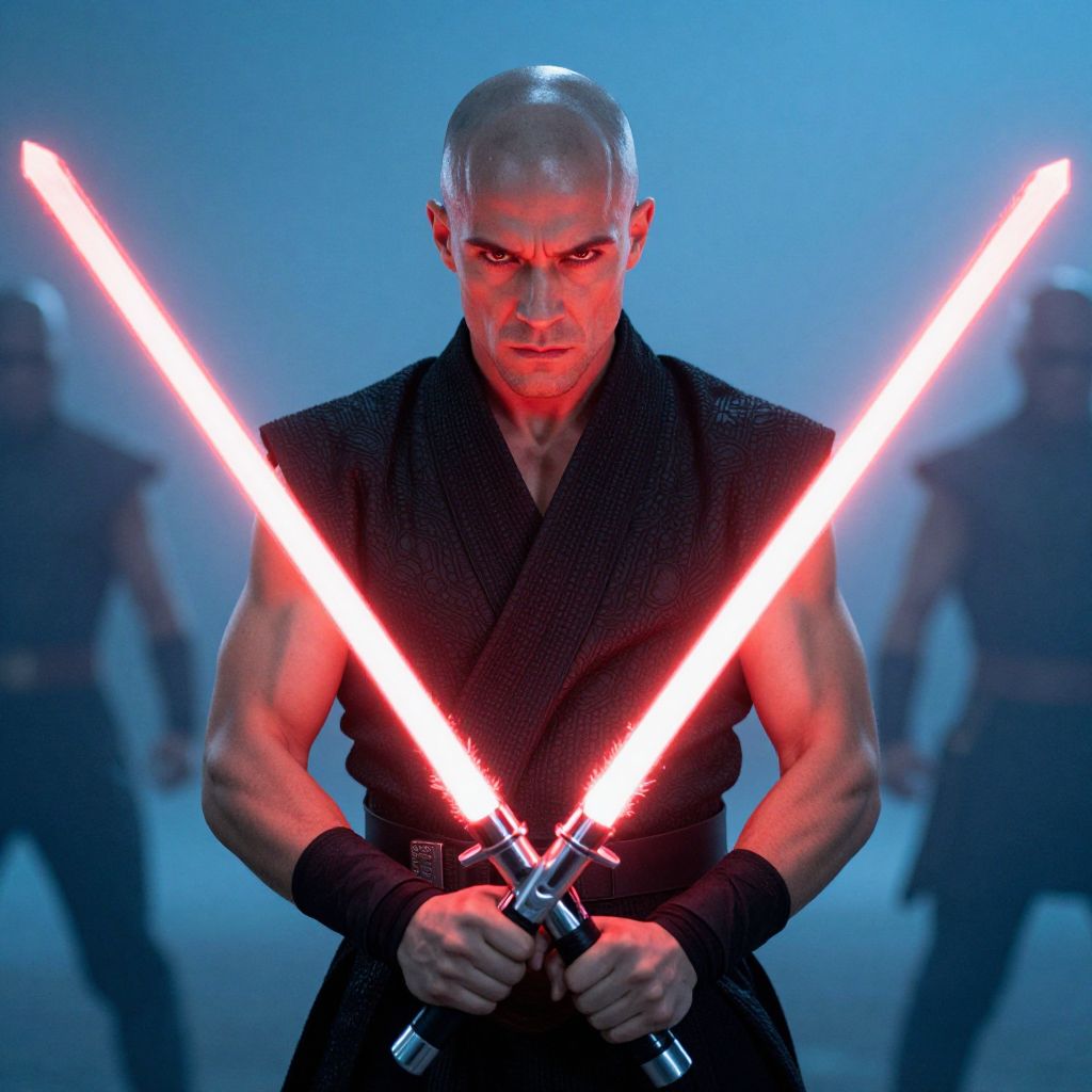 Photograph of a muscular, sweaty, brown-haired man in a white Jedi robe, gripping a lightsaber, with a dark sci-fi background.
