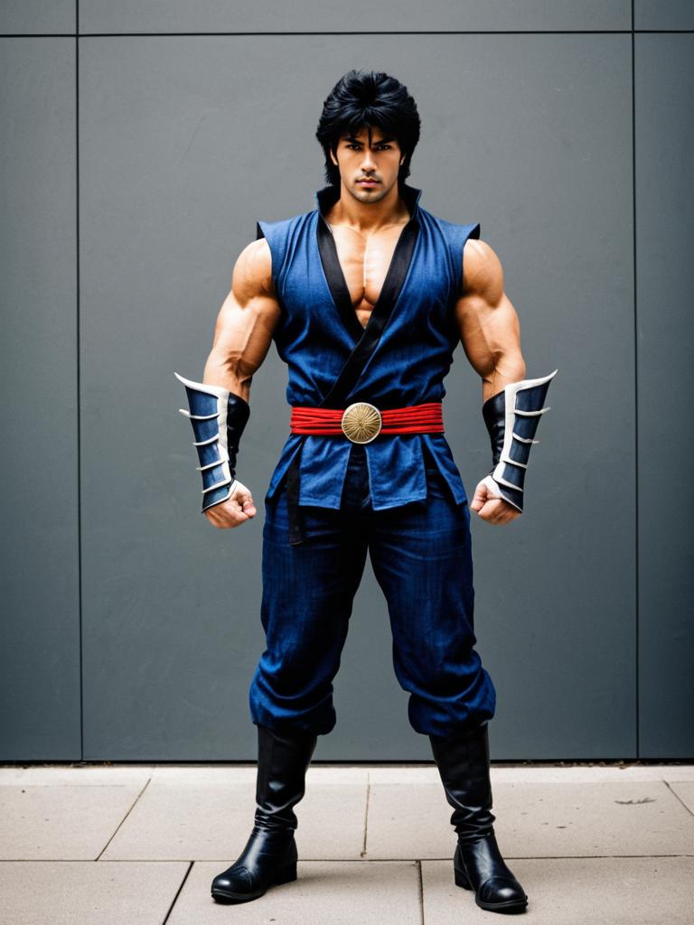 Photo-realistic cosplay photo of person in kenshiro costume. Full body. Standing. Full length. 1boy, black hair, scar, muscular, manly, muscular male
