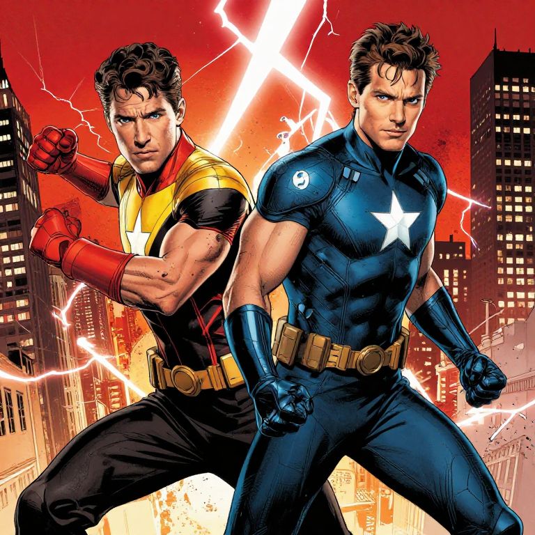 Dynamic comic book cover featuring Grant Gustin and Stephen Amell as heroic figures, bold colors, dramatic poses, lightning effects and gritty cityscape