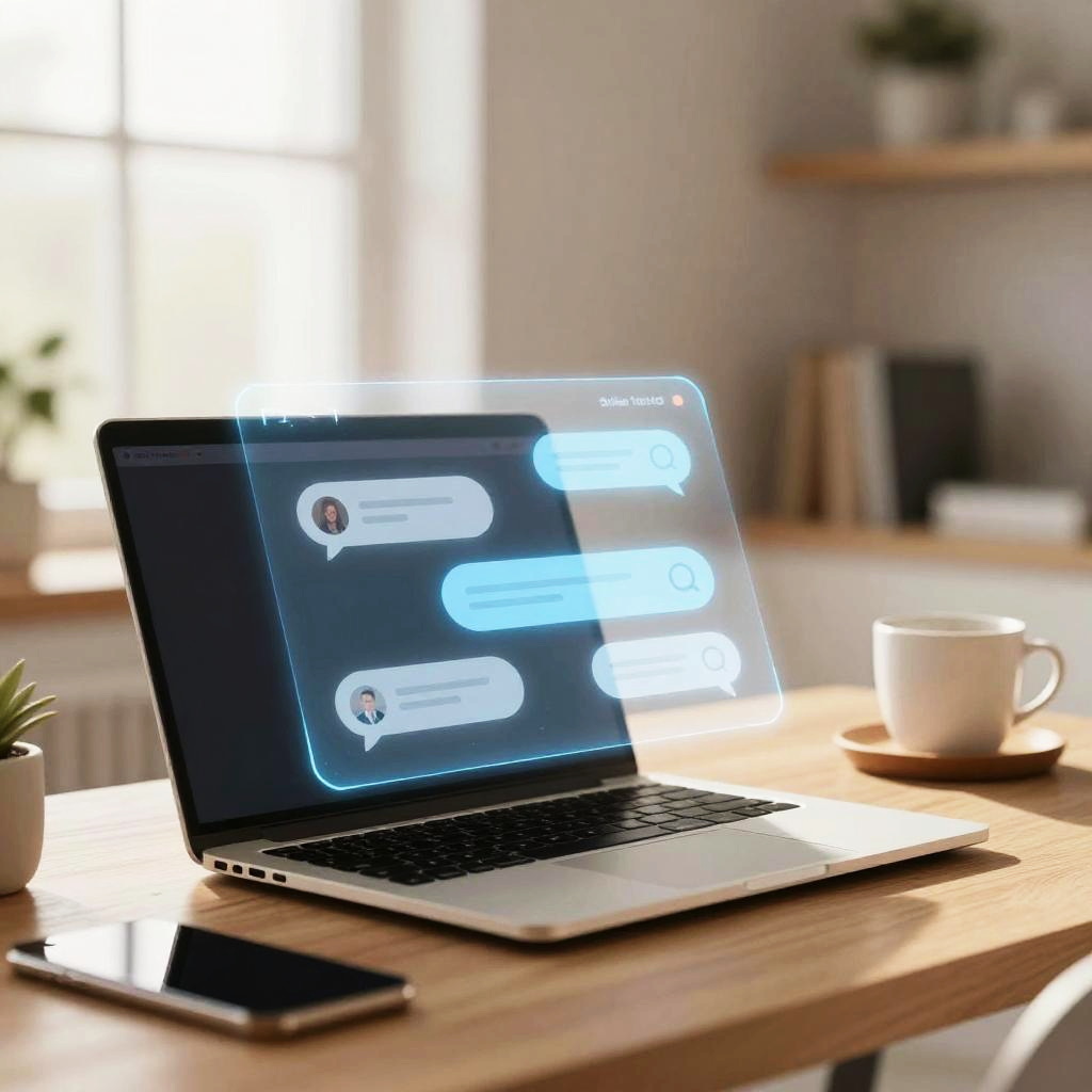 Aichat depicted in a cozy modern workspace featuring a holographic chat interface hovering above a sleek laptop, soft natural light streaming through the window, minimalist design with a warm color palette focusing on AI-driven conversation.