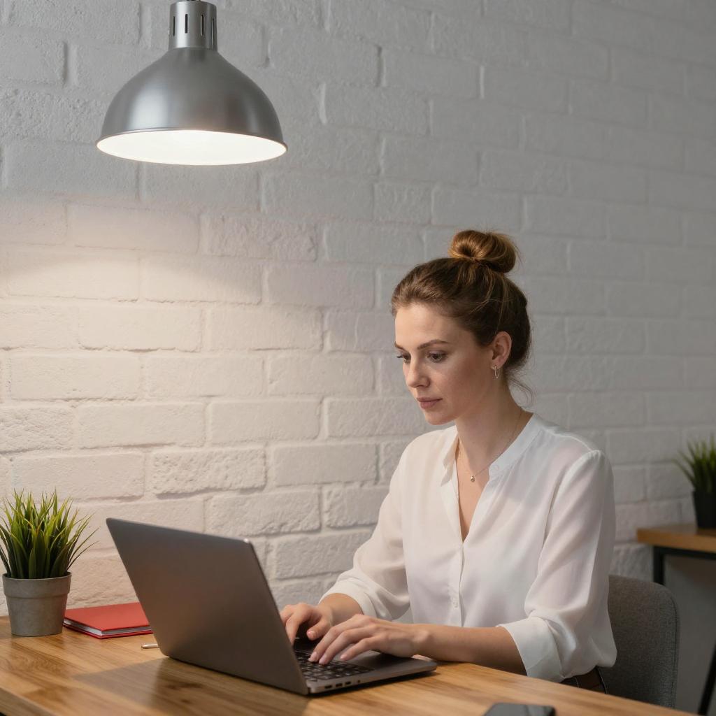 Photograph of a modern, sunlit office desk with a silver laptop open on a wooden surface. The laptop screen displays a text conversation with glowing blue messages. A white coffee cup sits to the right, and a black smartphone lies to the left. In the background, a blurred window lets in natural light, and a wooden shelf holds books and a small potted plant. The overall scene is bright and clean, emphasizing a contemporary work environment.