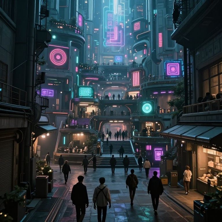 Neon-lit cybercity street at night, futuristic architecture with vibrant blue, pink, and purple signs, pedestrians walking, illuminated shops, and stair