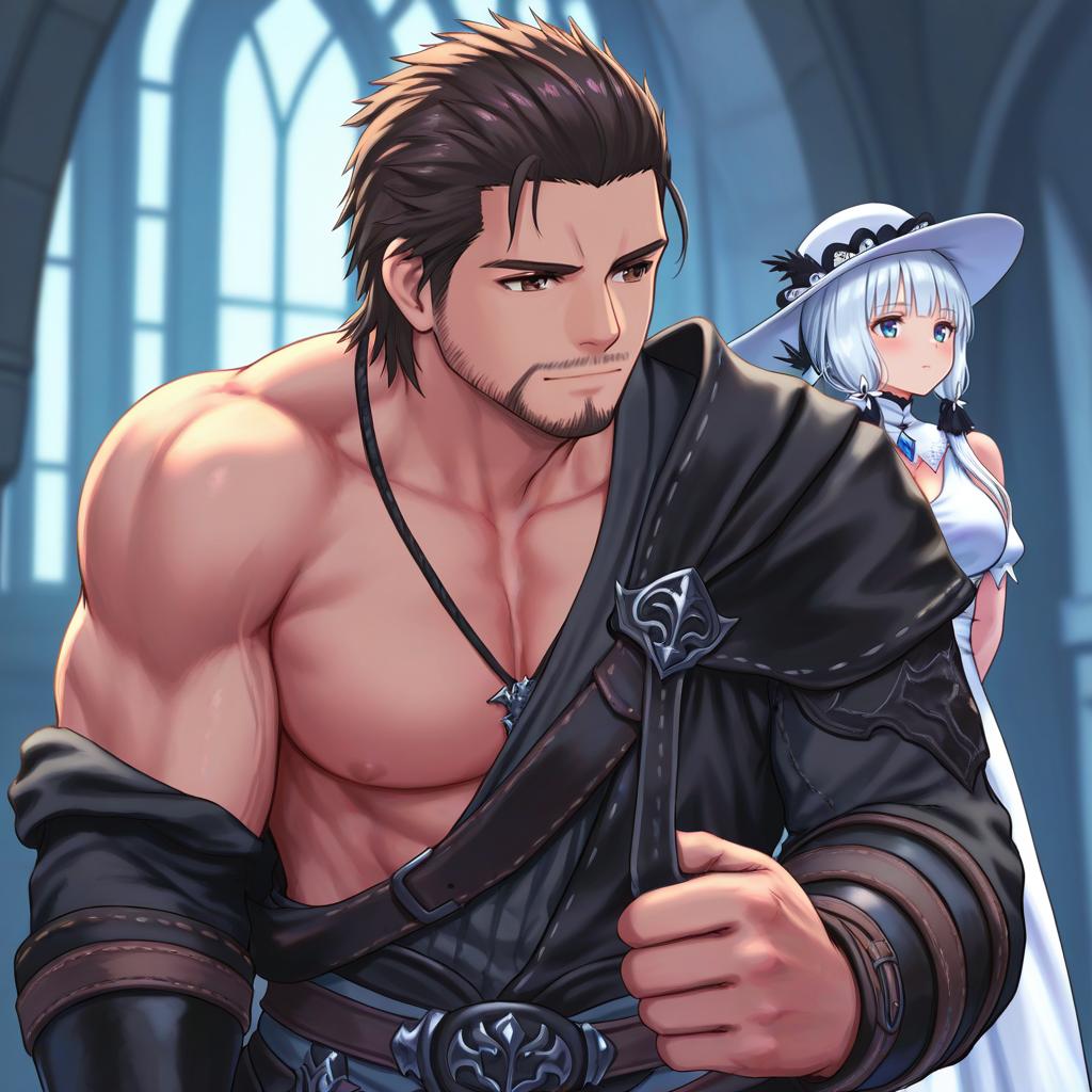 Akashi (live a hero), live a hero, 1boy, red eyes, thick eyebrows, short hair, red hair, gradient hair, nipples, thick thighs, scar on nose, bara, long sideburns, goatee, muscular male, large pectorals, abs, superhero costume, by artist kane-neko, illustrious