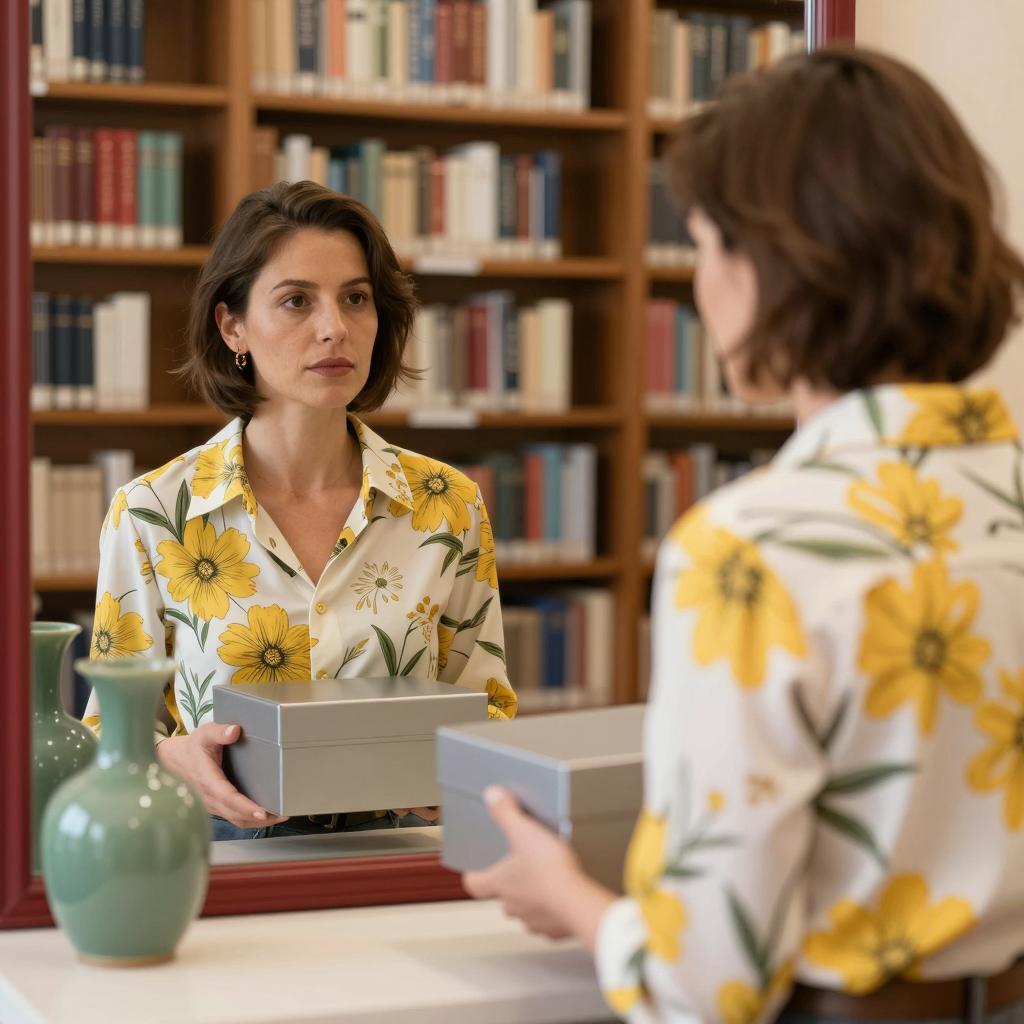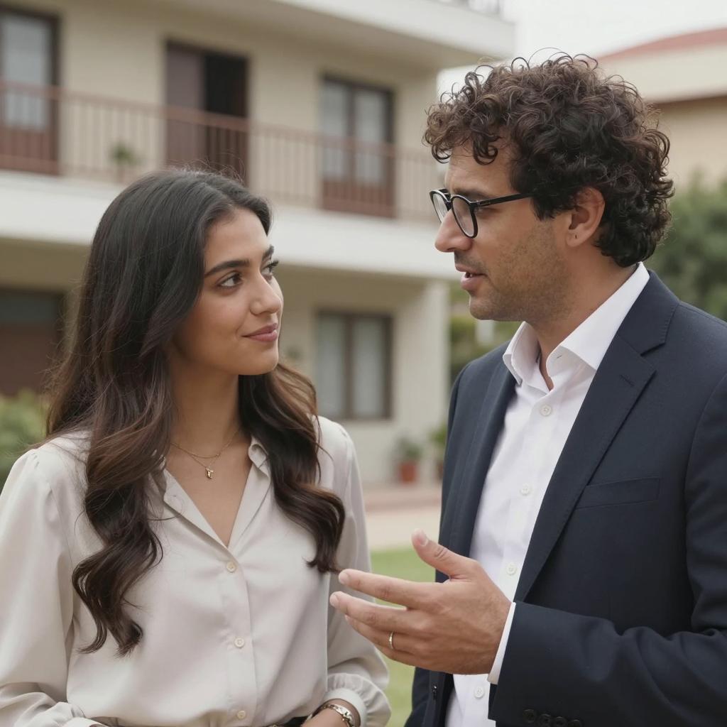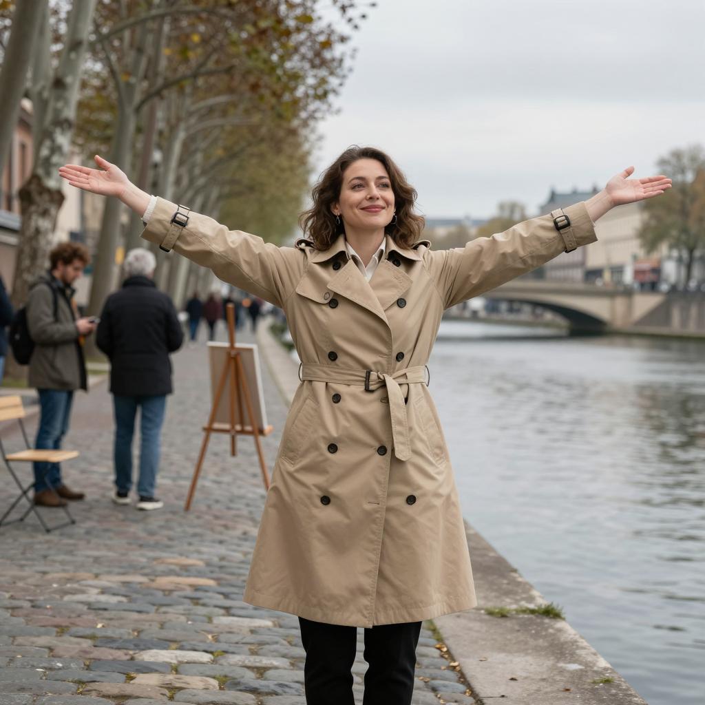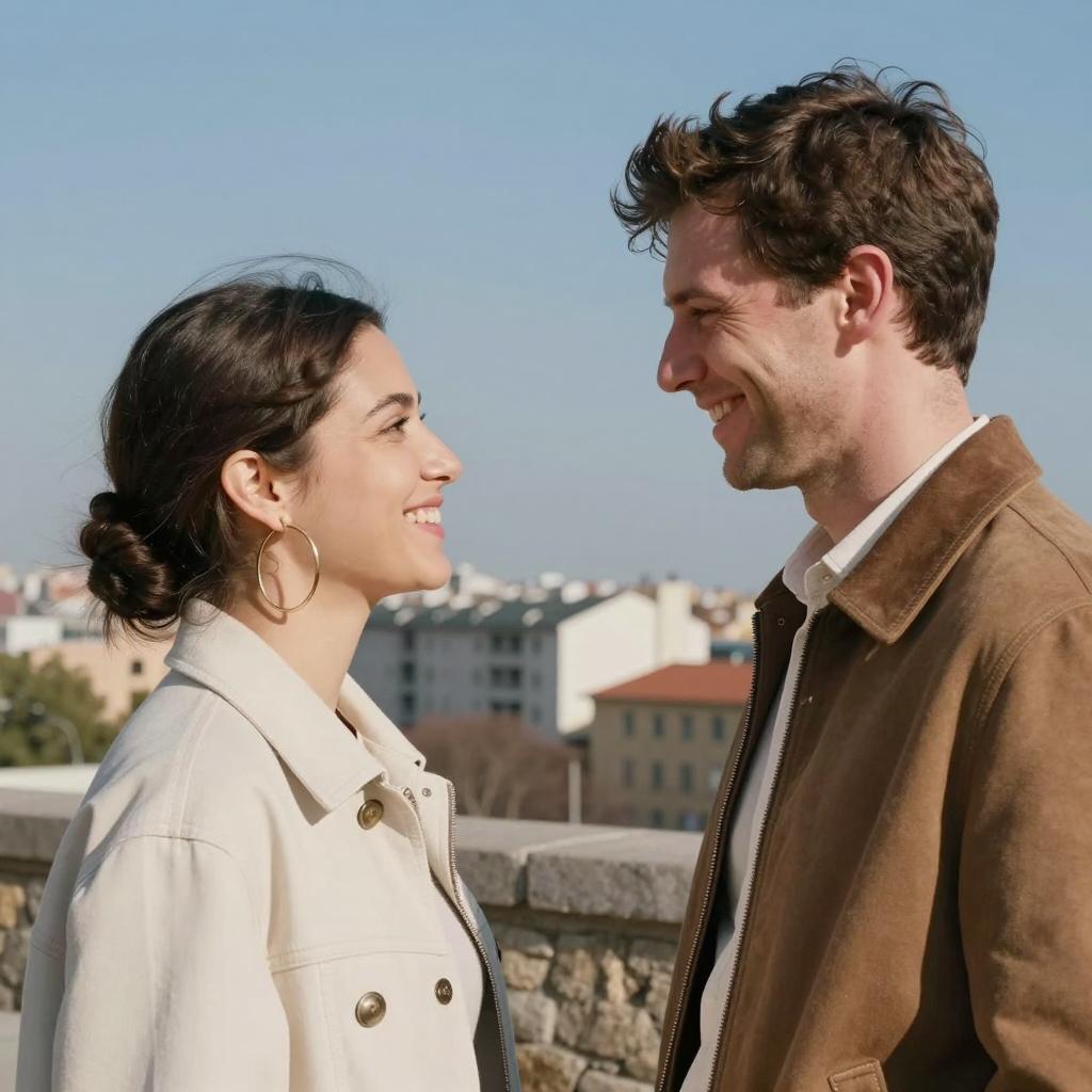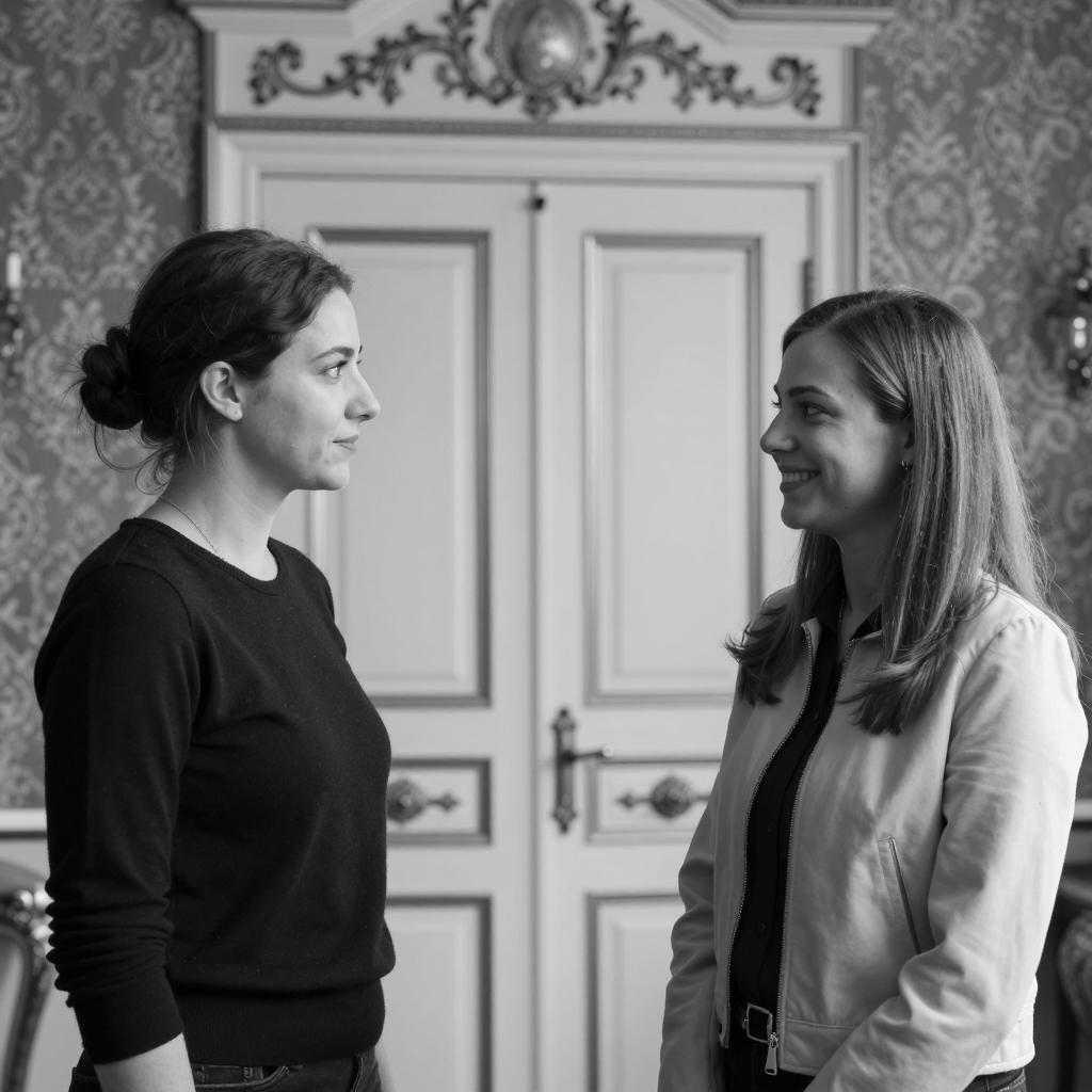 Two women on an outdoor stairway. Woman in foreground with brown hair, black coat, facing away. Woman in background with brown hair, black coat, orange scarf, leaning forward, smiling. Red structural element on left. Metal railings and concrete stairs. Tall trees and overcast sky in background. Both women wearing pants.