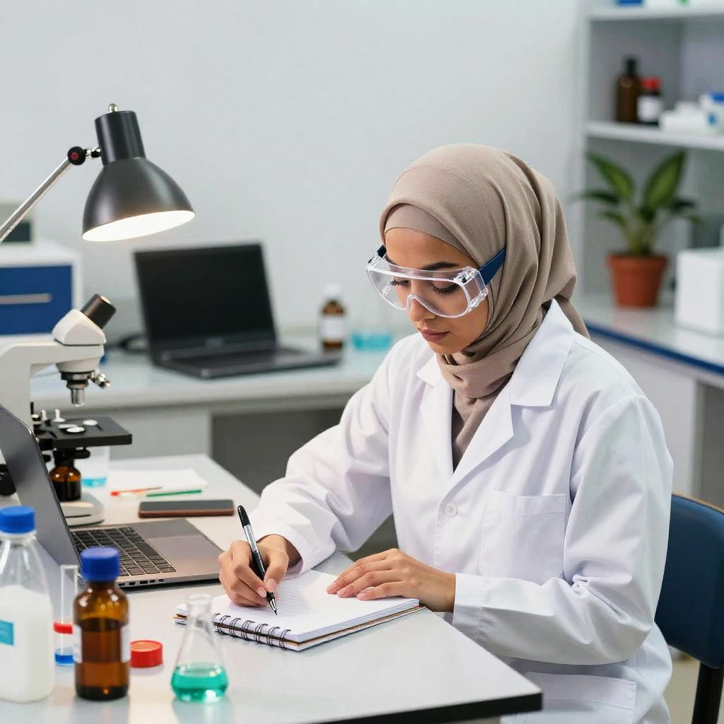 Photograph of a focused woman in a lab coat, brown hijab, and clear goggles, writing in a notebook at a bright, cluttered lab table. She has a pen in hand and is surrounded by various lab equipment, including bottles, a laptop, a black lamp, and a potted plant in the blurry background. The scene is well-lit with a white and blue color palette.