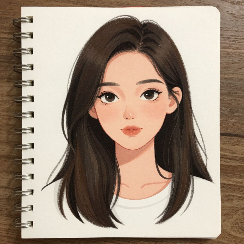 This digital drawing on a white sketchpad features a realistic anime-style portrait of an Asian woman with fair skin and large, expressive brown eyes. She has straight, black, shoulder-length hair with soft highlights, and is wearing a plain white shirt. The sketchpad is open with spiral metal rings on the left side, placed on a wooden surface. The woman's face is centered, and her expression is calm and slightly smiling. The artist's use of soft shading and precise lines gives her a delicate and attractive appearance.