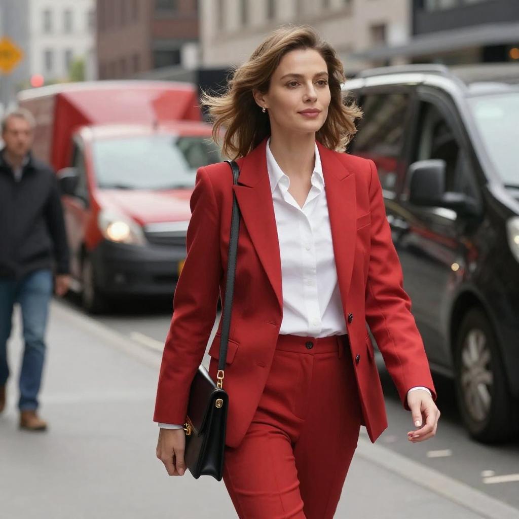 A confident businesswoman wearing a red blazer and white shirt walking on a busy city street. The background shows urban architecture with red and black vehicles and pedestrians. The woman carries a black leather folio and has light brown hair blowing in the breeze.