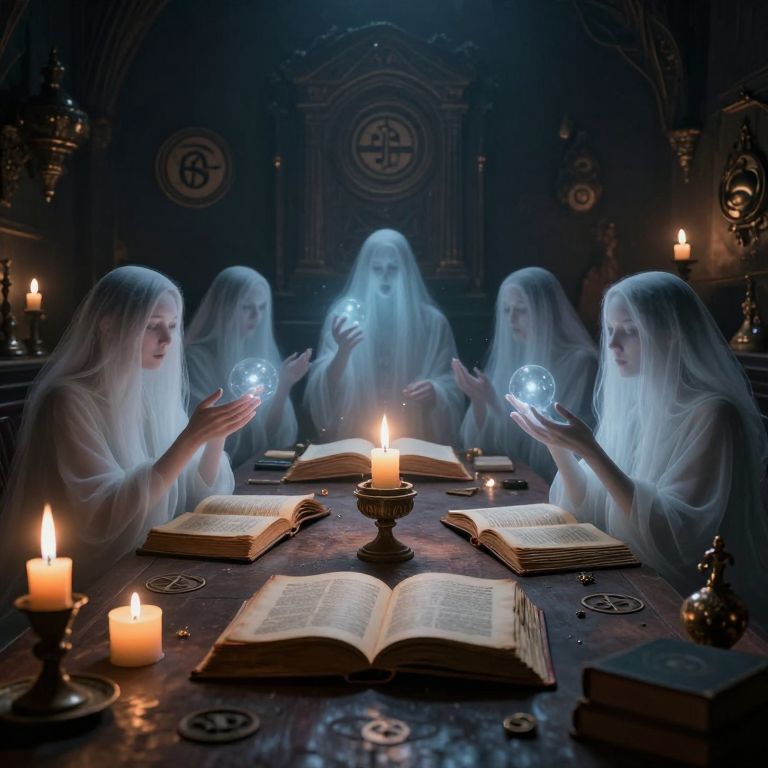 A photograph in a dark, Gothic-style room depicts five ethereal, ghostly women with transparent white robes, surrounding a wooden table. Each woman holds a glowing, orb-like crystal. Candles illuminate the scene, casting a warm, flickering light. Open books and circular symbols are scattered across the table. The background features ornate, dark wood paneling with circular medallions. The ghostly women's expressions are focused, adding a mystical, almost magical ambiance to the image. The overall lighting is low, with the candles providing the primary light source, emphasizing the glowing crystals and the translucent quality of the women's robes.