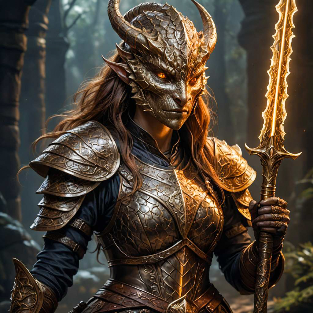 Dragonborn Female Warrior in Ornate Armor with Glowing Sword