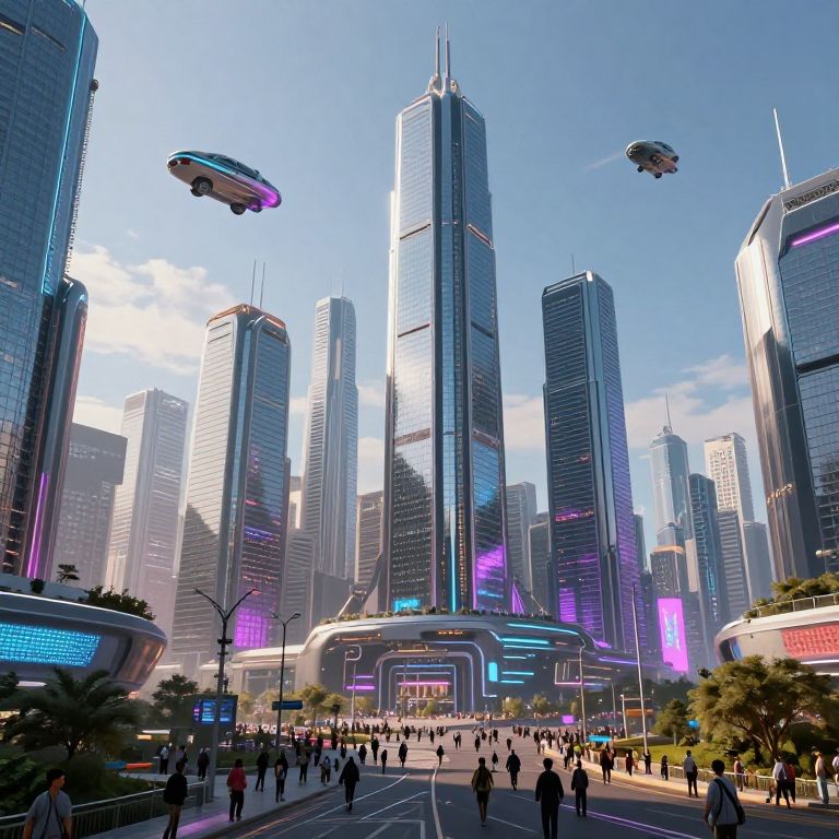 Photorealistic CGI of a futuristic cityscape with towering blue and purple-lit skyscrapers, flying hovercars, and a crowded street below.