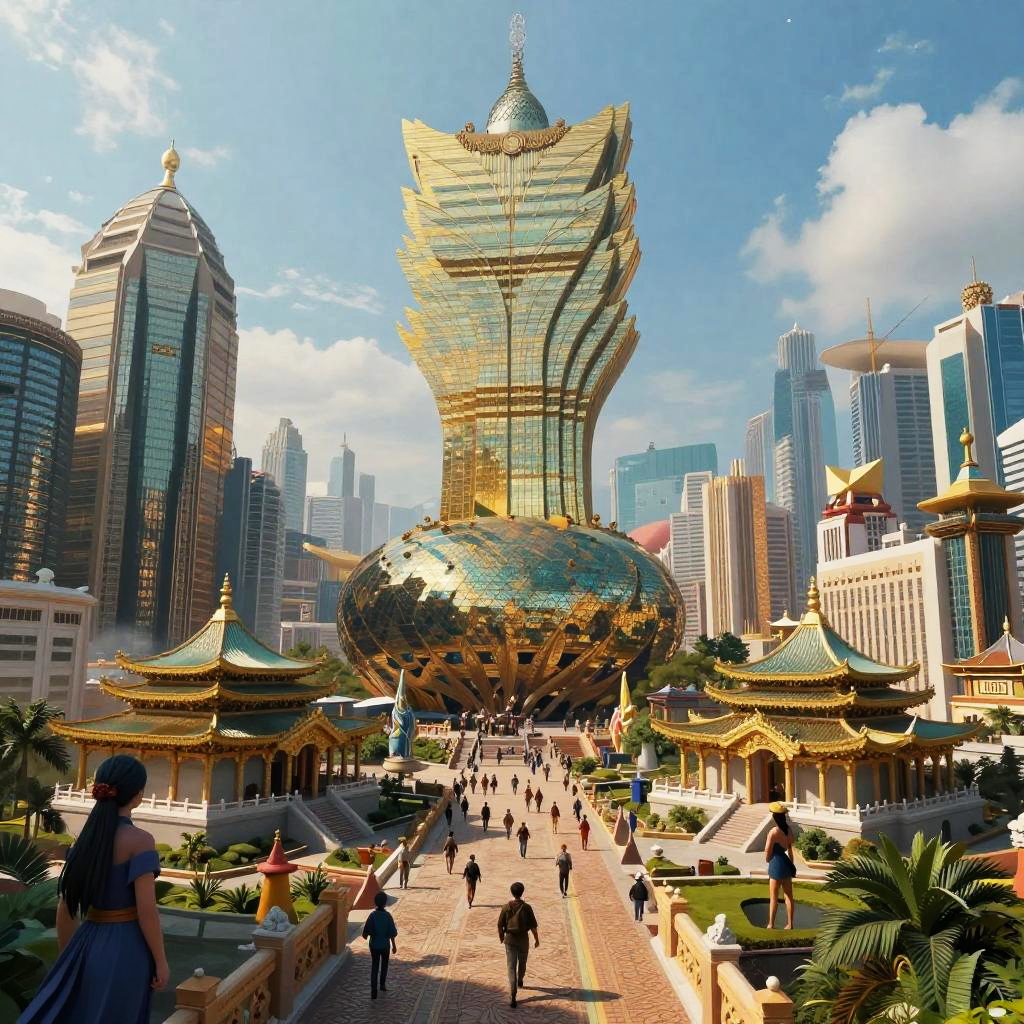 A characterchure scene showing a fantastical city inhabited by characters that are hybrid forms of humans and architectural masterpieces, blending ancient temples and modern skyscrapers, with a dynamic composition and a vibrant palette of blues and golds.