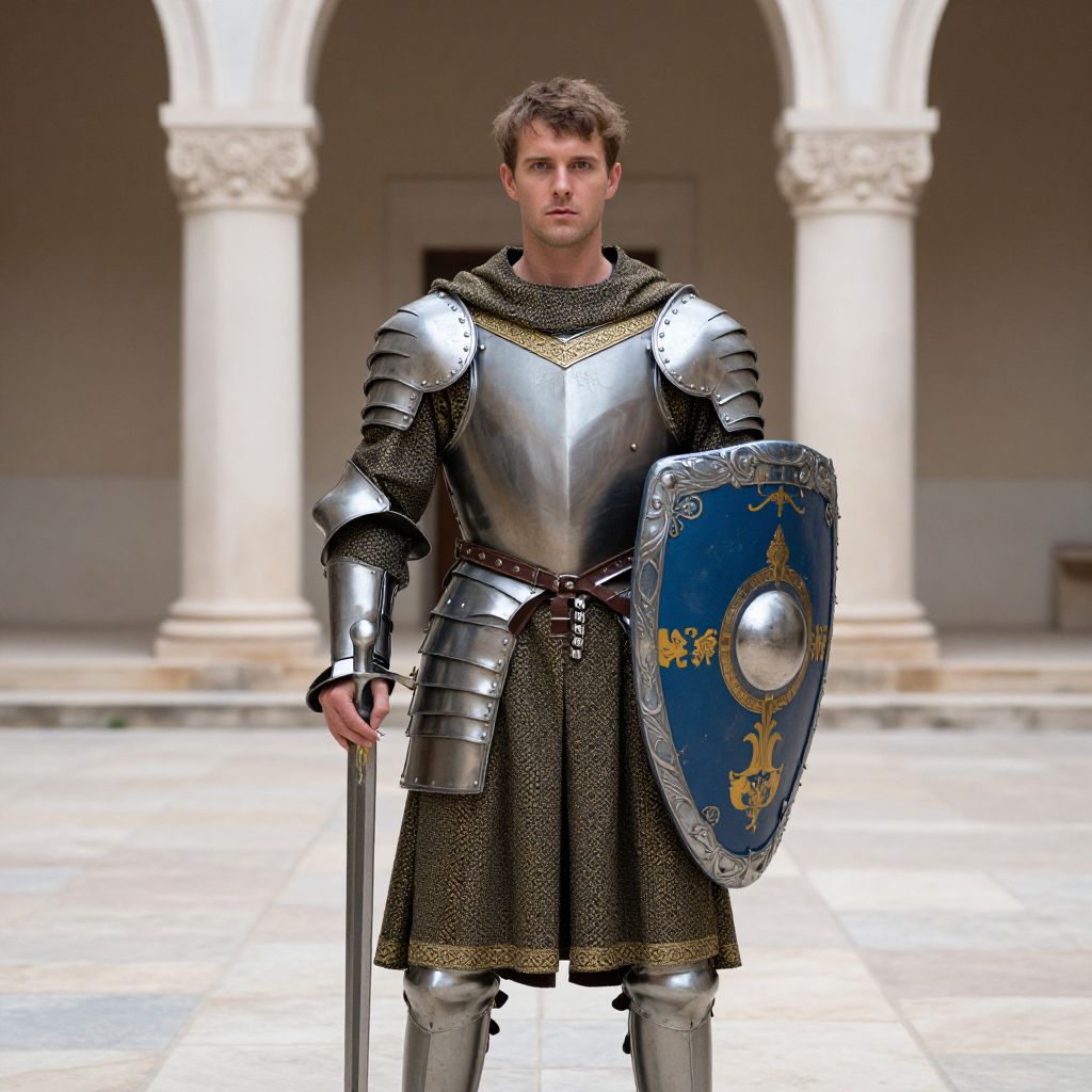 Photorealistic CGI of a young, serious male knight in shiny silver armor, holding a sword and blue shield with gold symbols, standing in a colon