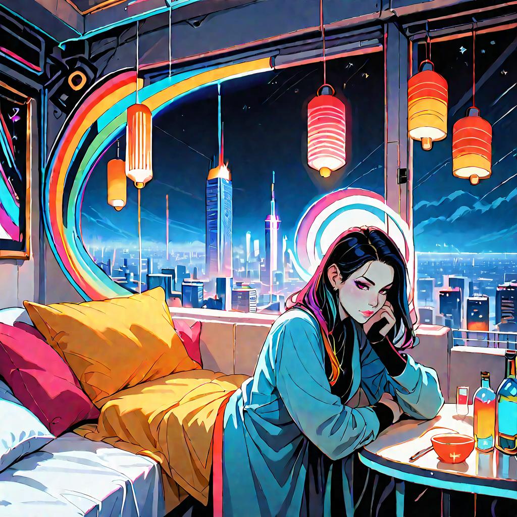 Score_9, score_8_up, score_7_up, cowboy shot, masterpiece, dynamic lights, high quality, highres, ach-ciloranko, ((chromatic aberration, colors saturation, vibrant colors)), (scenery, no humans:1.2), (highly detailed:1.2), (detailed background), indoors, pillow, window, bed, night, chair, table, bottle, scenery, couch, science fiction, city, lamp