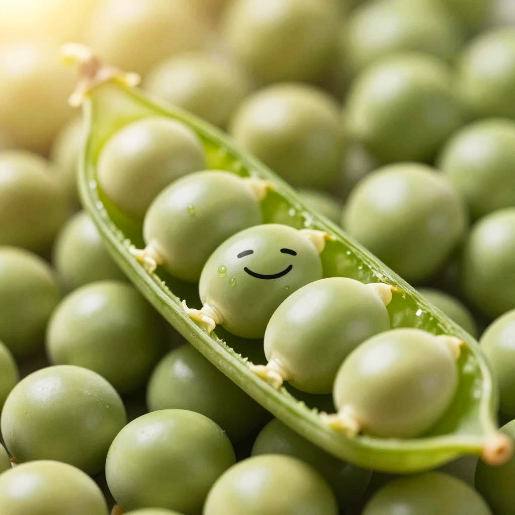 Closeup, amazing quality, masterpiece, best quality, hyper detailed, ultra detailed, UHD, perfect anatomy, portrait, dof, hyper-realism, majestic, awesome, inspiring, Capture the joy of life within a humble pea pod: tiny, smiling zhibi peas basking in the gentle warmth of the sun filtering through the open translucent pod. Let the radiance of nature's embrace illuminate their laughter, cinematic composition, soft shadows, national geographic style