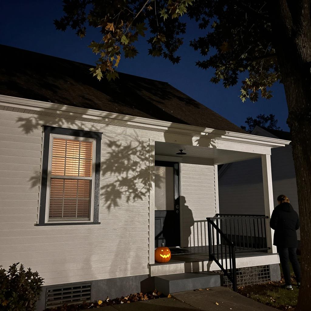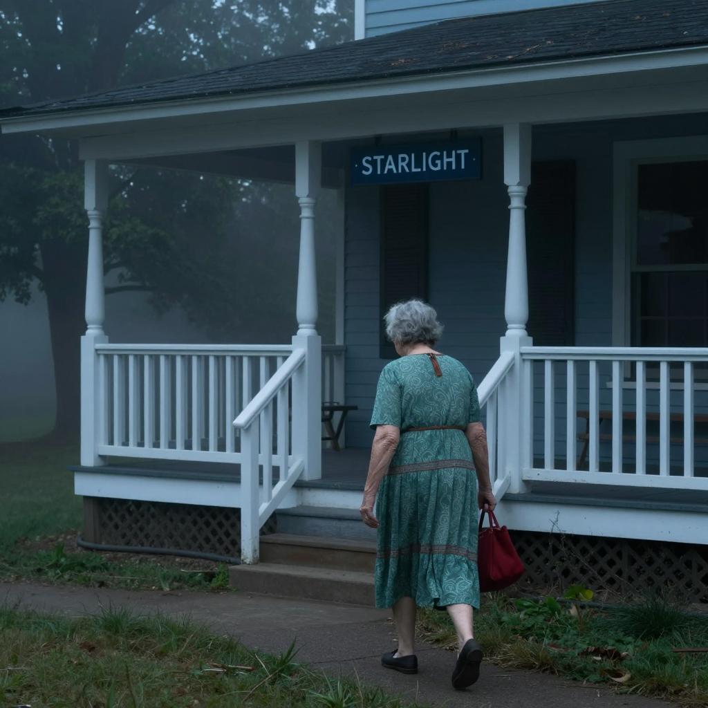 Old woman with short gray hair, wearing a green dress and carrying a red bag, walks away from a dark, misty porch with a "STARLIGHT" sign. Porch has white railing and steps, surrounded by grass patches. Dim blue lighting. Tree on the left.