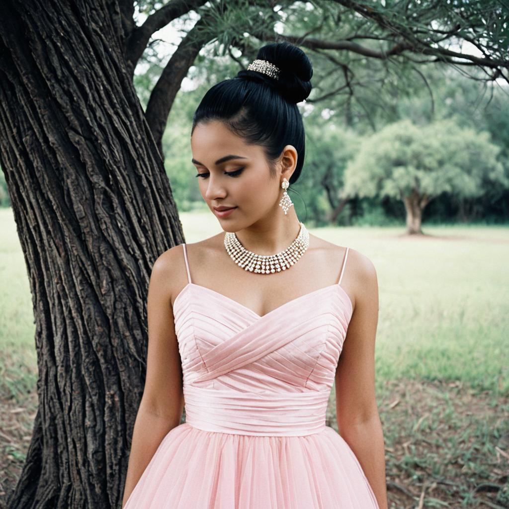 Portrait of a young woman with black hair styled in a bun, wearing a light pink sleeveless dress with ruched detailing. She is accessorized with a pearl or diamond necklace, matching earrings, and a hairpiece. The setting is outdoors near a large tree with green foliage in the background.