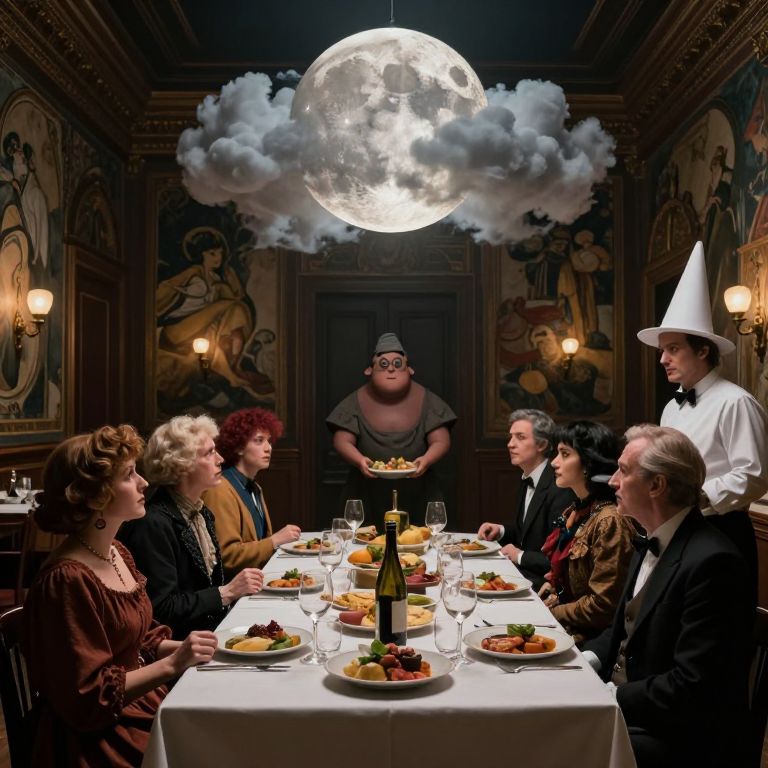In the dimly lit, opulent restaurant at the end of the universe, a surreal gathering unfolds. A large, cloud-covered moon hangs majestically from the ceiling, casting an ethereal glow over the scene. The walls, adorned with intricate, aged frescoes, add to the otherworldly ambiance. At the center of the room, a grand table is set for a feast, with plates of food and bottles of wine arranged meticulously. A group of figures, dressed in eclectic, period-specific attire, stands and sits around the table, their expressions and postures suggesting a mix of curiosity and solemnity. Two servers, one with a large, bulbous body and the other in a white, conical hat, stand ready to attend to the guests. The overall composition is balanced yet dynamic, with elements interacting in a harmonious yet intriguing manner, creating a sense of both mystery and grandeur.