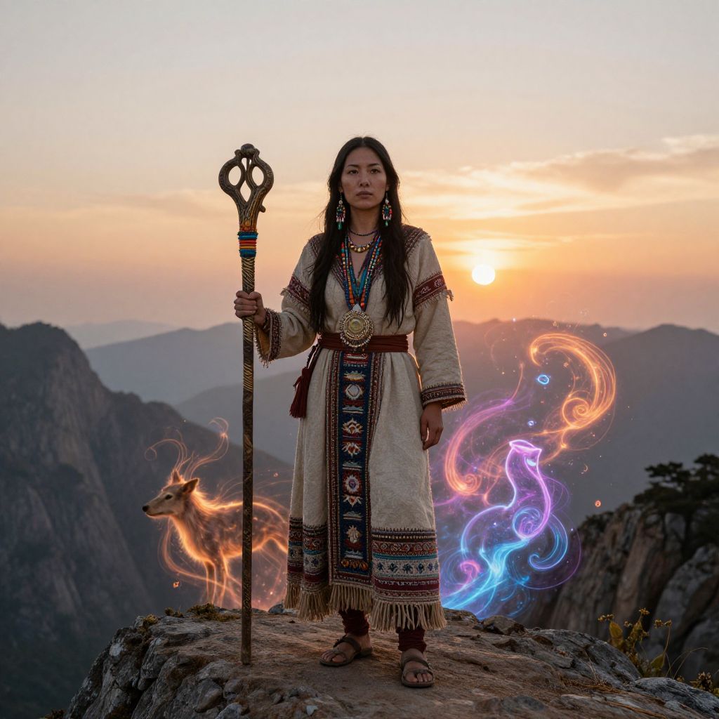 Chamanique forest landscape with a wise shaman meditating near a sacred fire, enveloped by glowing runes and floating symbols, exotic plants and wildlife visible, ethereal lighting, intricate patterns on clothing, fantasy style, atmospheric and spiritual.