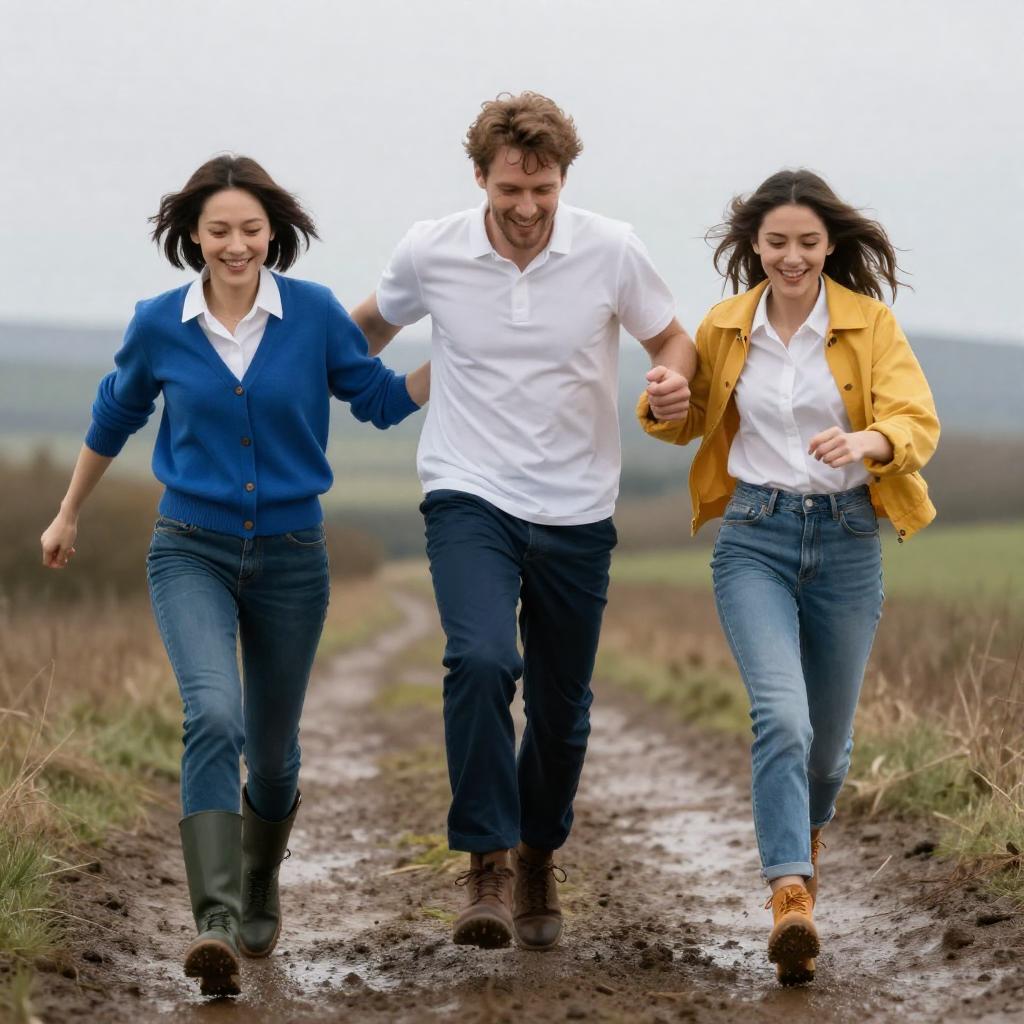 Photograph of two people running through a wooden archway covered in blue and white balloons. The woman in the foreground has brown hair, wears a maroon long-sleeve shirt and black pants, smiling. The man behind her has dark hair, wears a blue shirt and black pants, slightly bent forward. They are on a hay bale with a wooden structure and snow on the ground in the background. Two other people are partially visible in the background, one wearing blue.