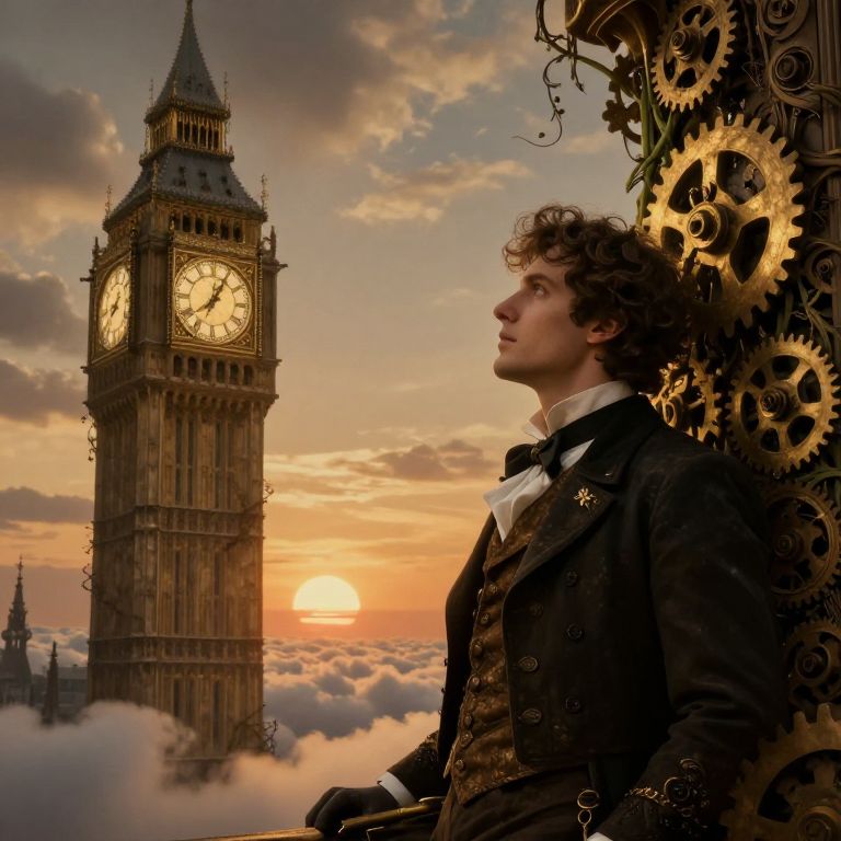 A Victorian-era figure stands poised at the edge of an immense skyscraper, his silhouette sharply defined against the vibrant glow of the city below. The scene harmoniously fuses steampunk engineering with Art Nouveau sophistication, as ornate brass gears and clockwork elements embellish his attire while delicate filigree patterns outline the towering structures. Under the moonlit sky, a mystical fog drifts in, weaving an enchanting dance of shadows that seem to narrate their own tale. The camera's vantage point offers a rare overhead perspective, capturing the breathtaking fusion of historical opulence and futuristic ingenuity, invoking a sense of amazement at the confluence of time periods and aesthetics.