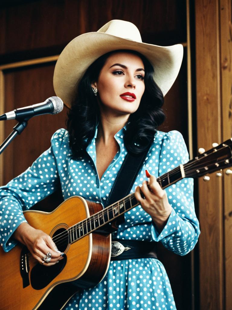 Portrait of a woman dressed in a blue polka dot country music singer costume, wearing a beige hat and elegant jewelry, including earrings and a necklace. She is playing an acoustic guitar and singing into a microphone, with an amplifier visible in the background. The setting features wooden panel walls, enhancing the country music atmosphere.