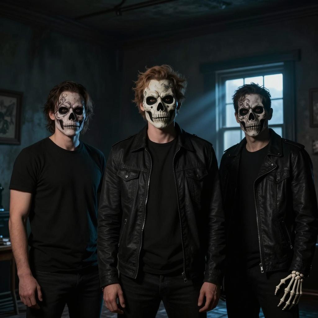 Photograph of a person with a white-painted face and dark hair in a black outfit, standing in front of a mirror. Multiple reflections of the person are visible, showing them with clenched fists. Yellow-framed mirror with round light bulbs. Person's expression is focused. Background is blurred. Five visible reflections of the person.