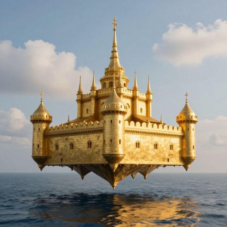 Floating medieval castle with golden towers and spires, reflected on calm ocean, against a blue sky with scattered clouds.