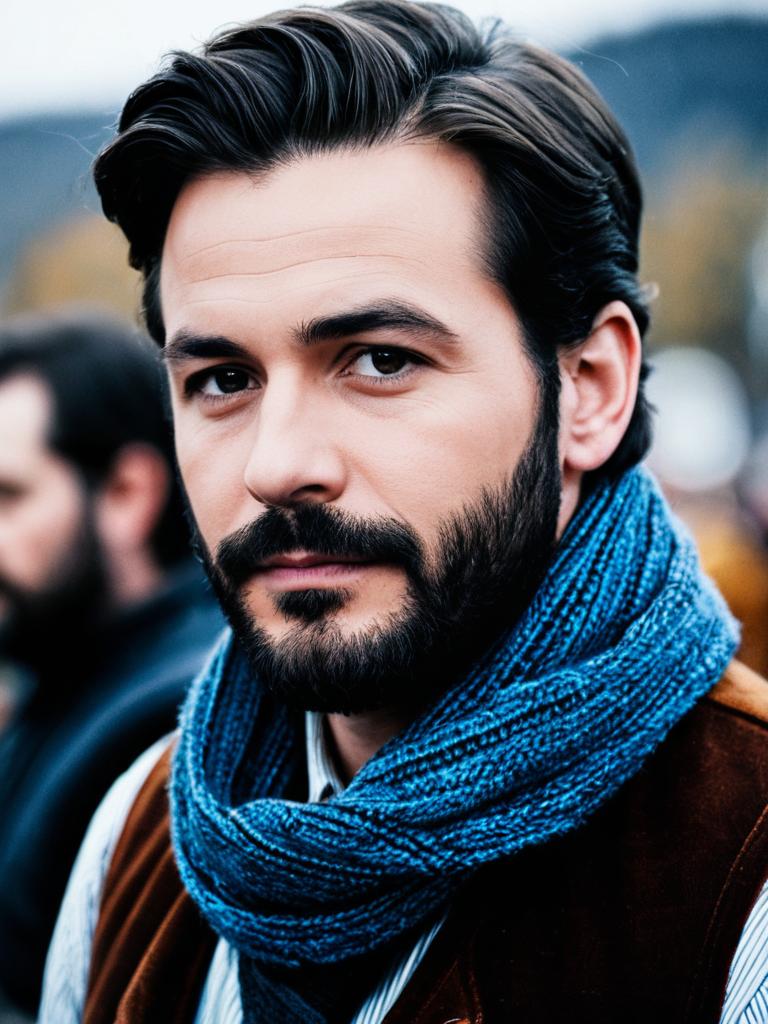 Portrait of a young man with dark hair, a full beard, and mustache, wearing a blue knitted scarf and a brown vest over a striped shirt. The background is blurred, emphasizing his blue eyes and serious expression. The image has a realistic and photorealistic quality, with a focus on facial features and clothing details.