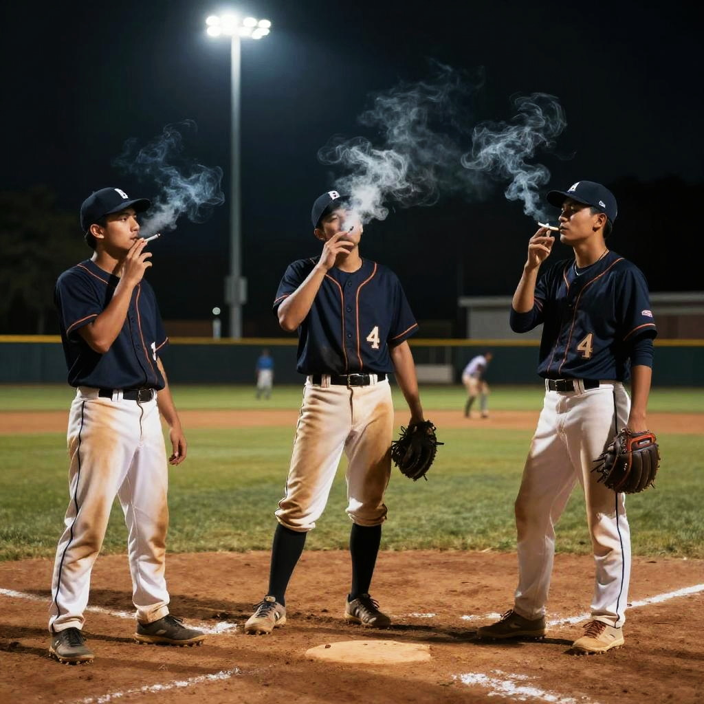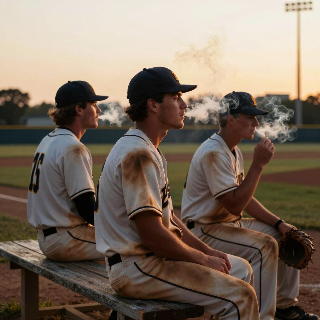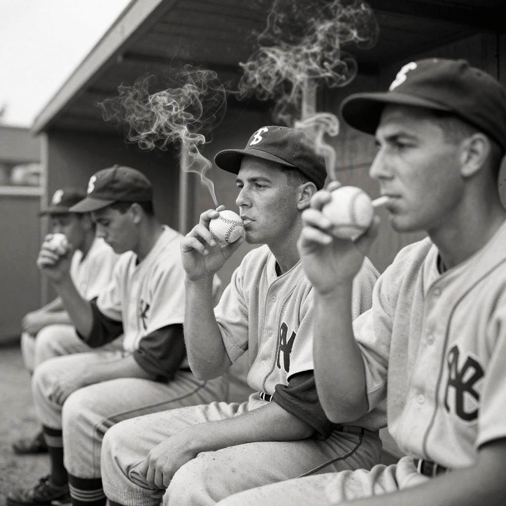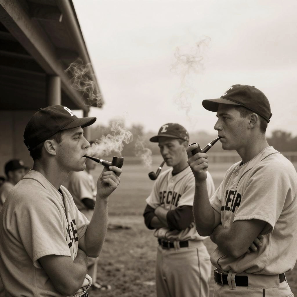 Baseball players smoking old-fashioned pipes near the dugout, dusk setting with a misty backdrop, nostalgic 1940s ambiance, sepia tones, highly detailed facial expressions and smoke curls