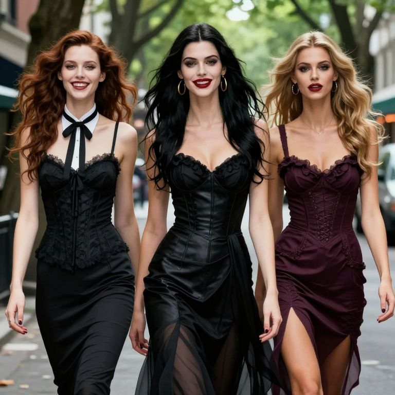 Fashion Illustration photo of modern beautiful vampires go to city from forest, 2000s, happy, photorealistic, natural light,