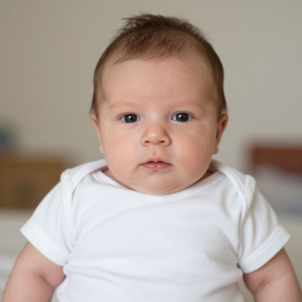 Photograph of a baby with fair skin and blue eyes, wearing a white, hooded onesie with a small wooden button on the left side. The onesie has a corded drawstring at the neckline. The baby's expression is neutral, and the hood is slightly tilted back. The background is a solid, dark brown color, making the baby the focal point. The lighting is soft, highlighting the baby's face and the texture of the onesie. The overall composition is simple and centered, emphasizing the baby's innocent and calm appearance.