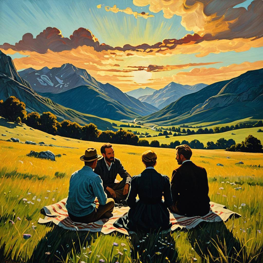 Oil painting depicting four people sitting in a circle on blankets in a sunlit mountain meadow during sunset. The scene features vivid colors and detailed brushwork with dramatic clouds and sun rays illuminating the valley and surrounding mountains.