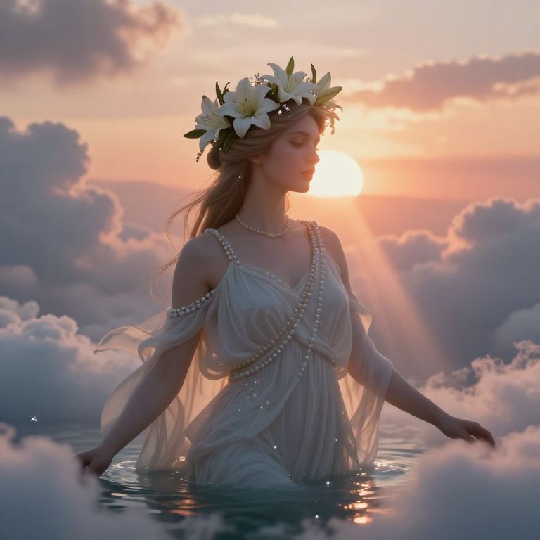 Aphrodite fantasy art scene illustrating the goddess emerging from a mystical lagoon under a radiant sunset, adorned with a crown of lilies and shimmering pearls, dreamy clouds and gentle light rays framing her silhouette, enchanting and otherworldly composition.