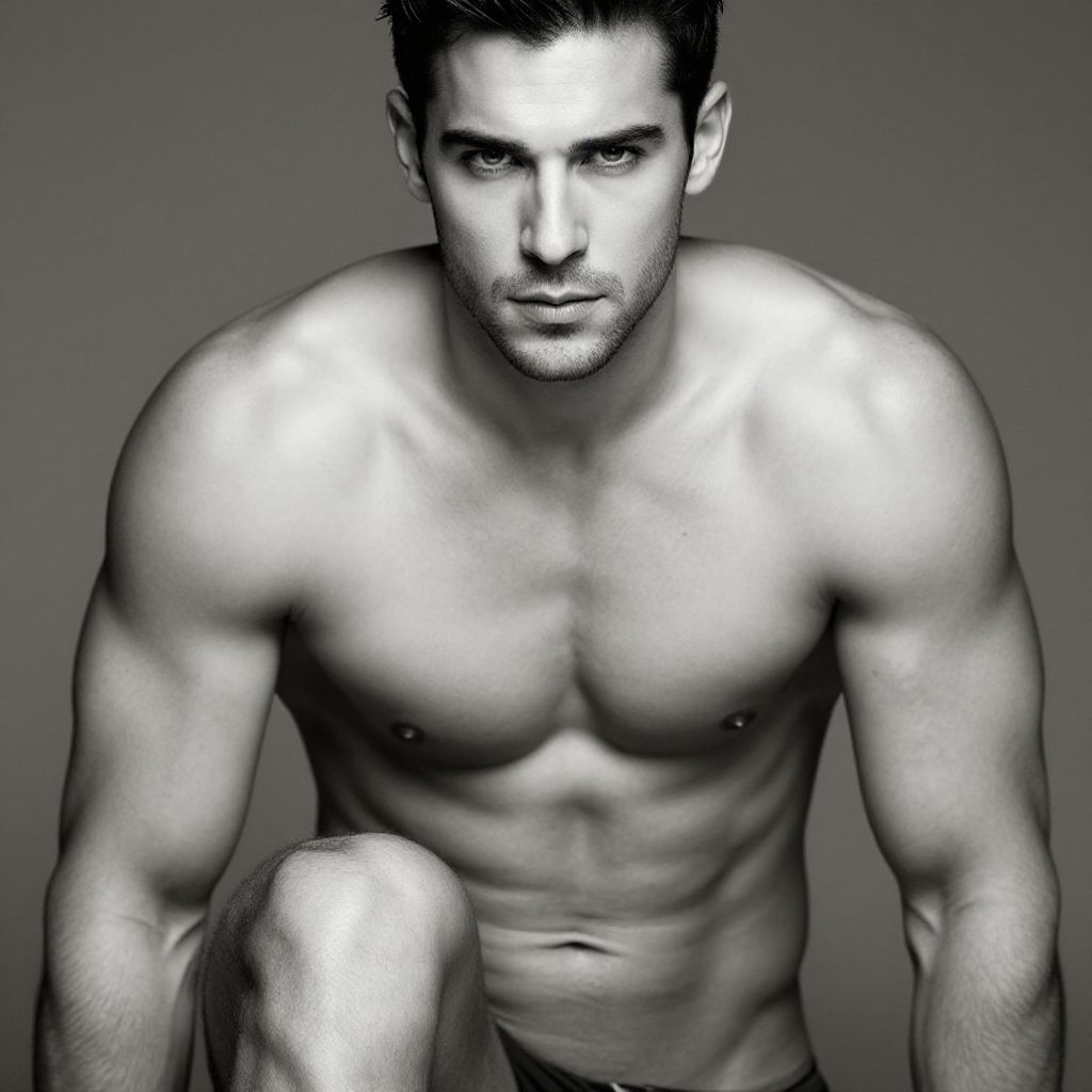 Intense gaze, rugged features, chiseled male abs, defined pectorals, broad shoulders, powerful legs, athletic build, toned arms, masculine charm, clean lines, neutral tone, black and white filter, high contrast, dramatic lighting, eye level shot, shallow depth of field, focus on subject. Man has masculine face and piercing eyes