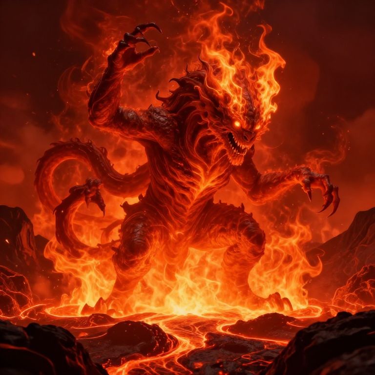 A writhing mythical creature with multiple limbs and fiery eyes, rising from molten lava in a volcanic landscape, intense orange and red hues, fantasy art style, powerful and chaotic energy, highly detailed and textured skin.