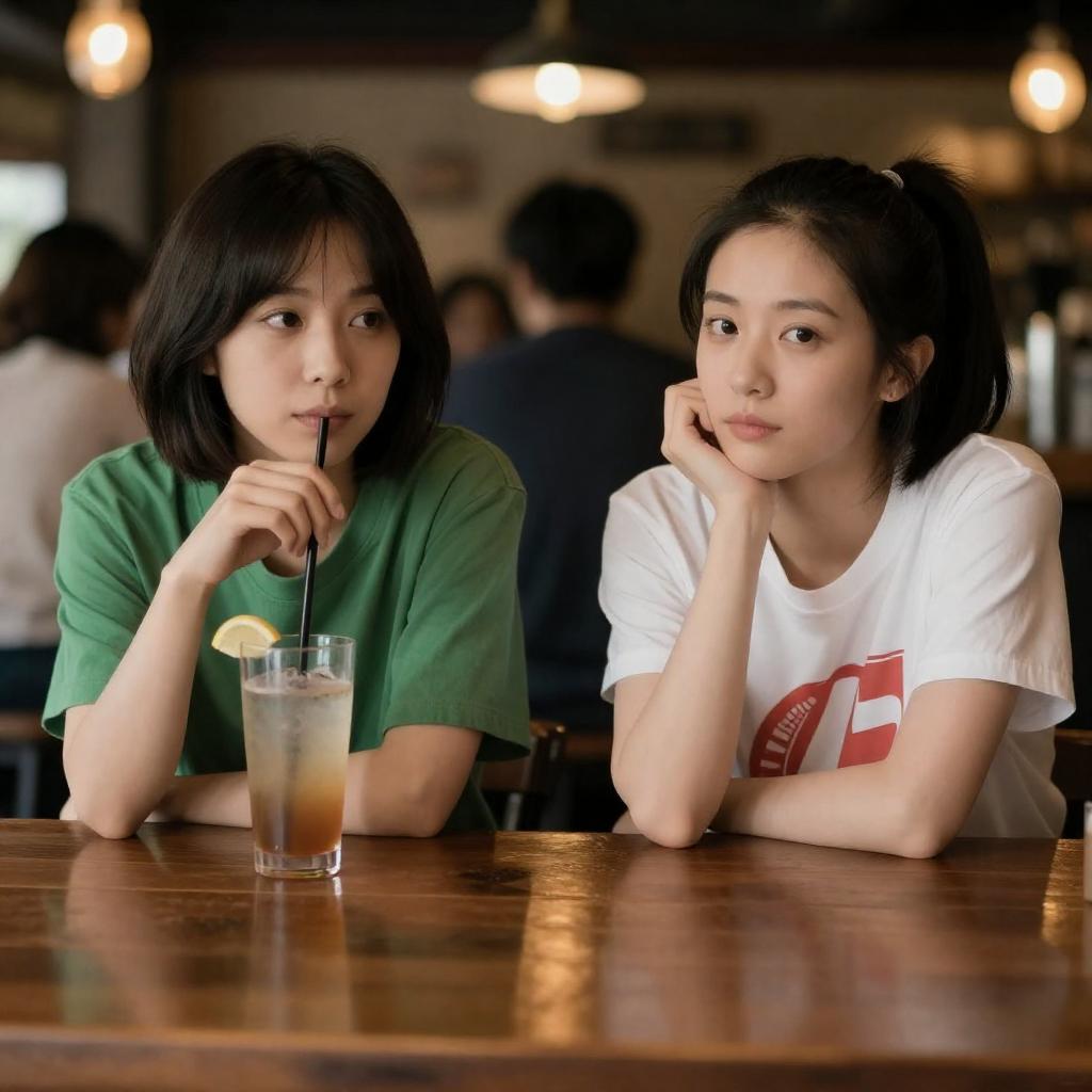 Photograph of two women sitting at a bar. The woman on the left has short black hair, wears a green shirt, and holds a drink with a straw. The woman on the right has black hair in a ponytail, wears a white t-shirt with a red graphic, and rests her head on her hand. Both have neutral expressions. Background shows blurred patrons and warm lighting. Wooden bar counter in foreground. Both women wear dark leg warmers.