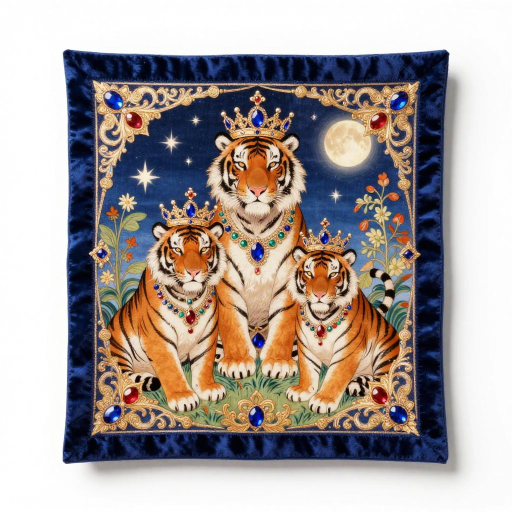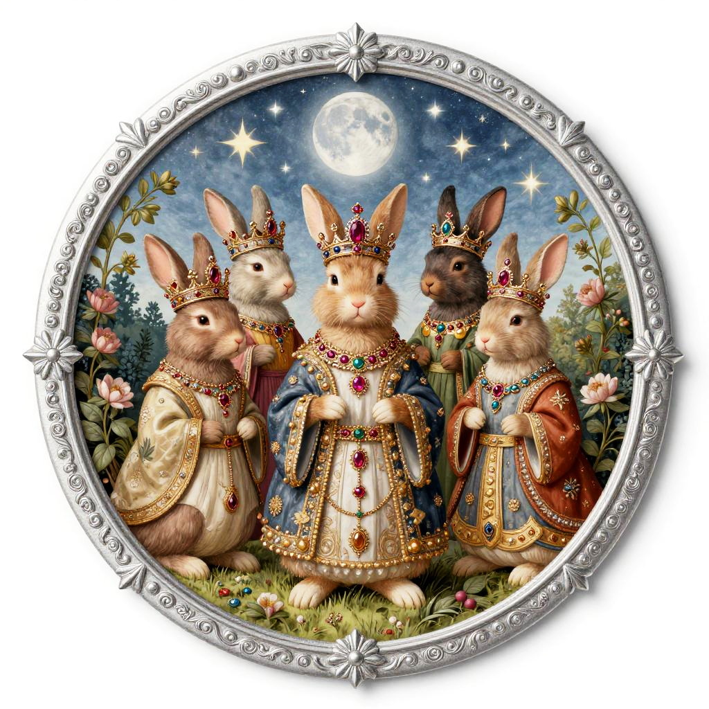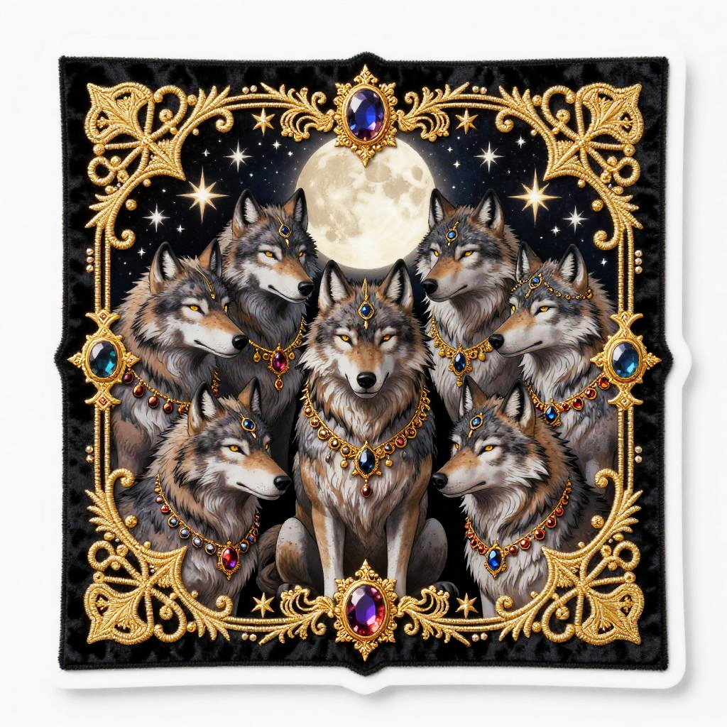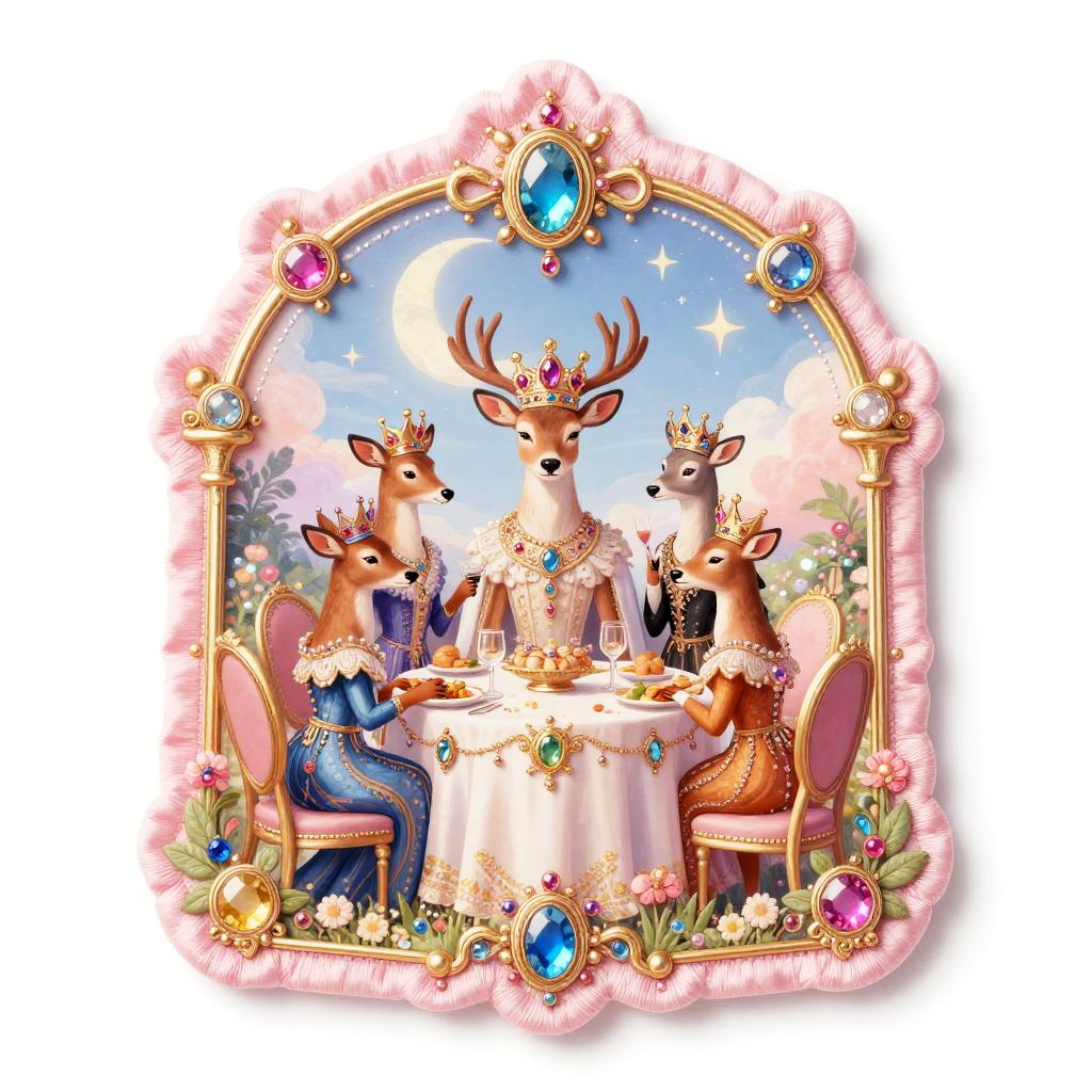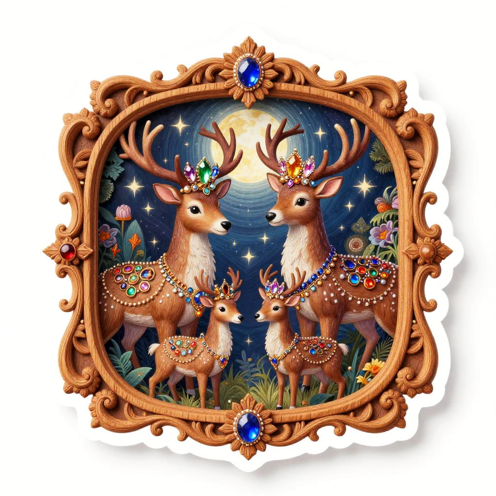 Editing 2d, solid white background, crimson velvet gold stitched border, sticker, medieval tapestry inspired illustration, detailed ornate fantasy scene of royal bear family wearing ruby-encrusted collars wearing colorful gemstone jewelry, stars and moon in bright sky