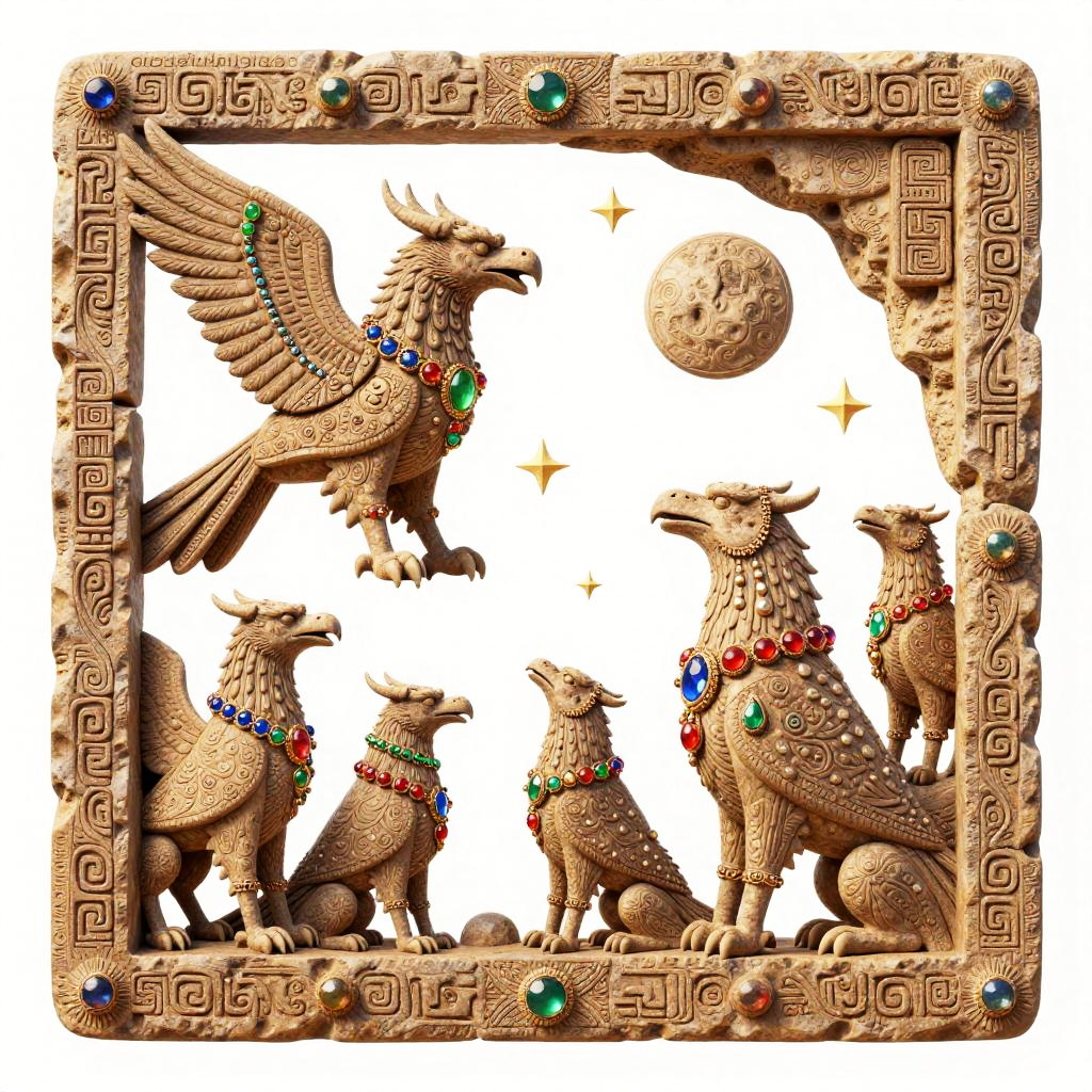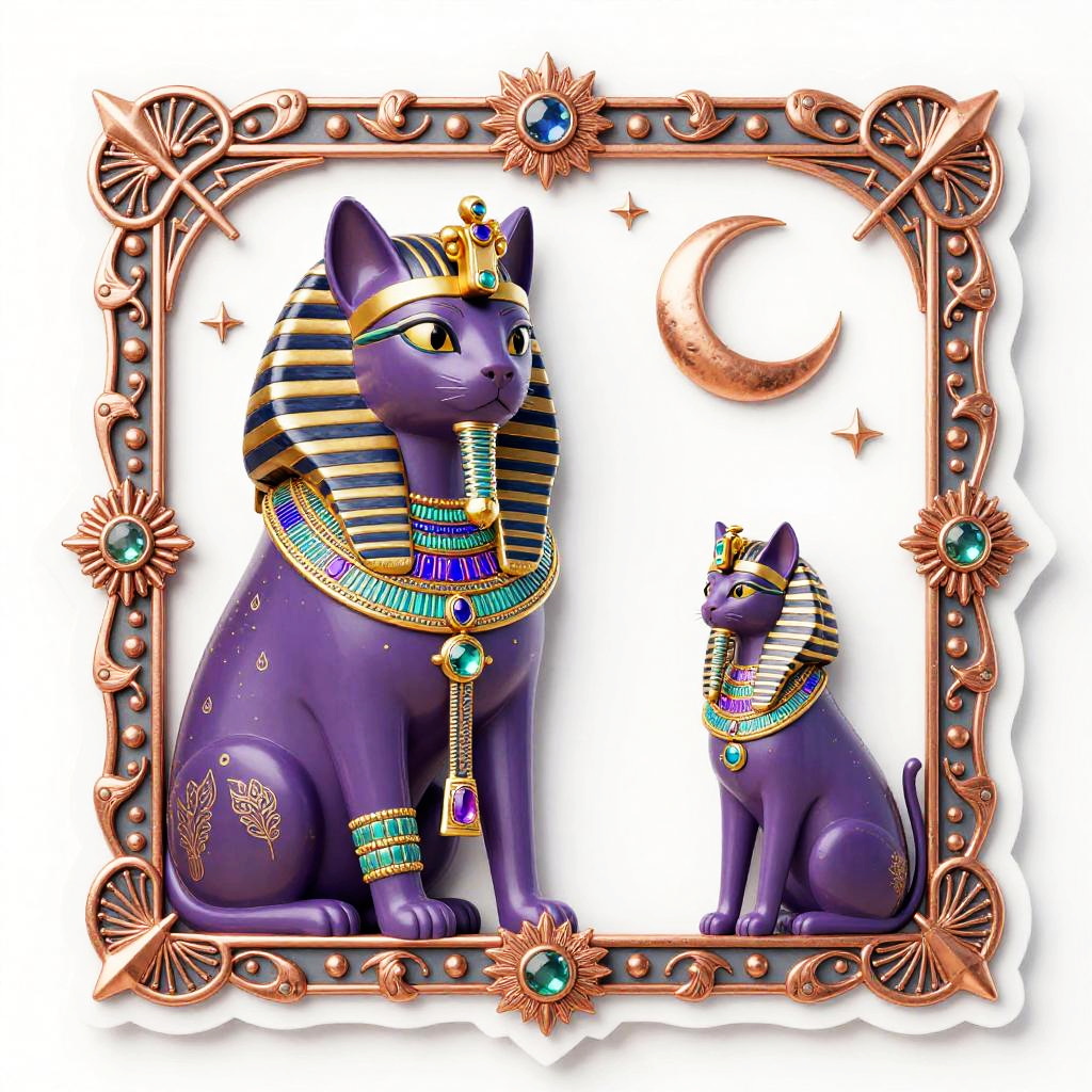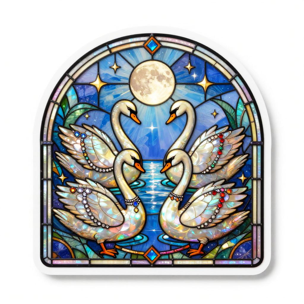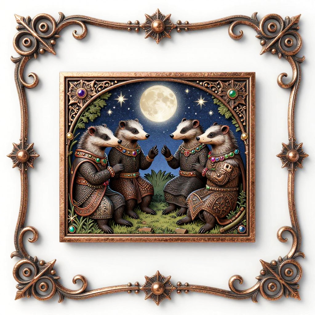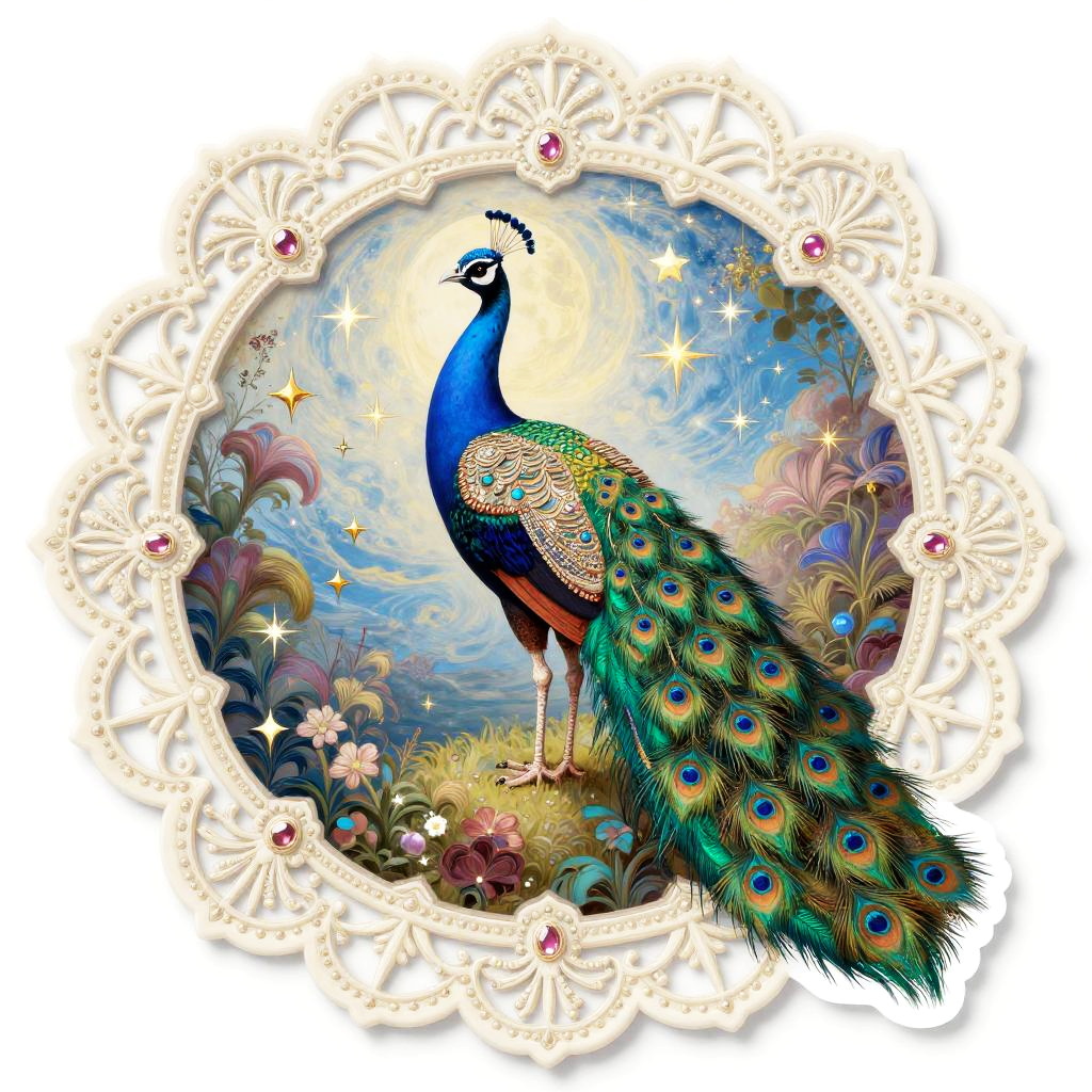 Editing 2d, solid white background, crimson velvet gold stitched border, sticker, medieval tapestry inspired illustration, detailed ornate fantasy scene of royal bear family wearing ruby-encrusted collars wearing colorful gemstone jewelry, stars and moon in bright sky