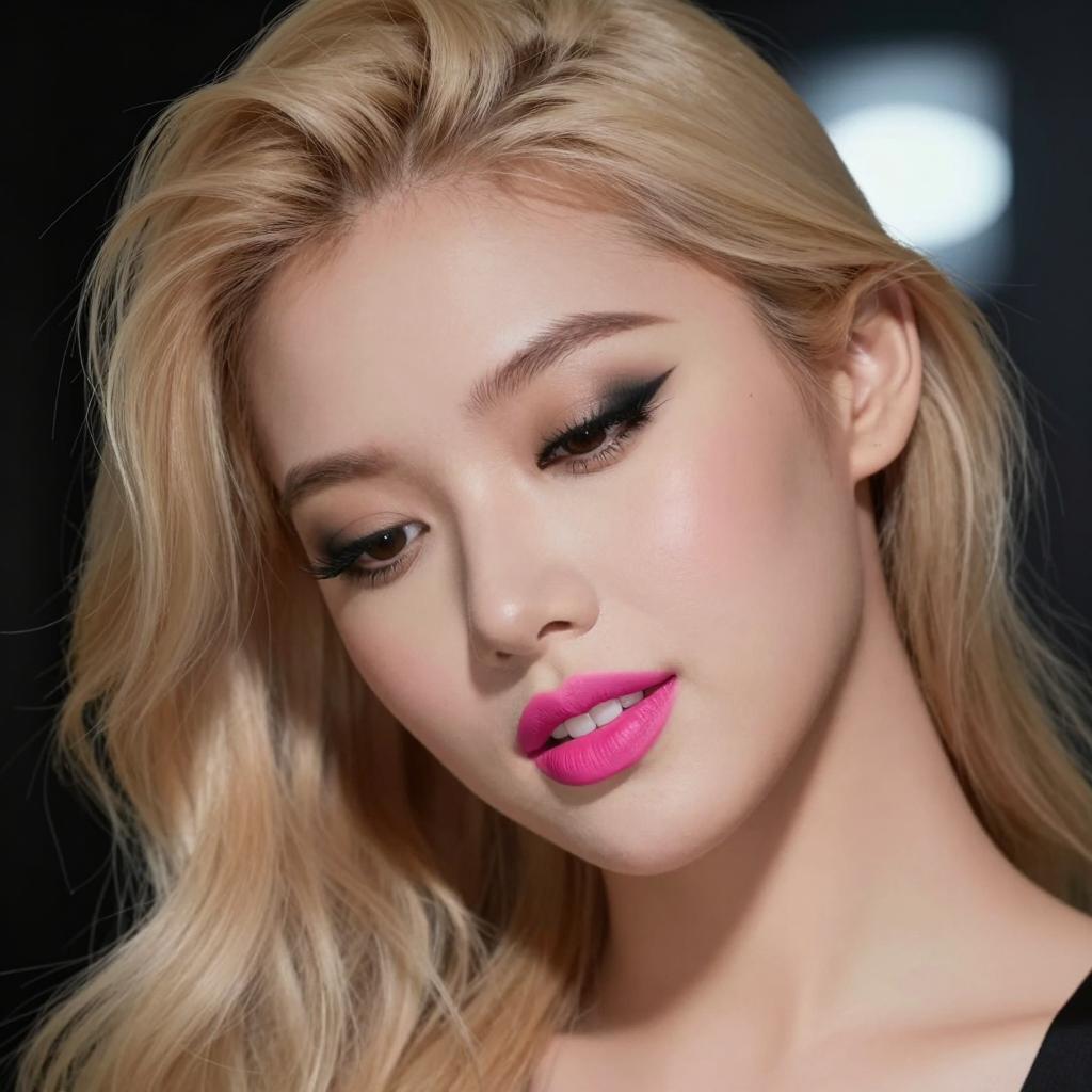 A woman with blonde hair, heavy black eyeliner, and bright pink lipstick. She is looking downward with a slight smile. Her face is tilted to the right. Background is dark with blue and white light reflections.