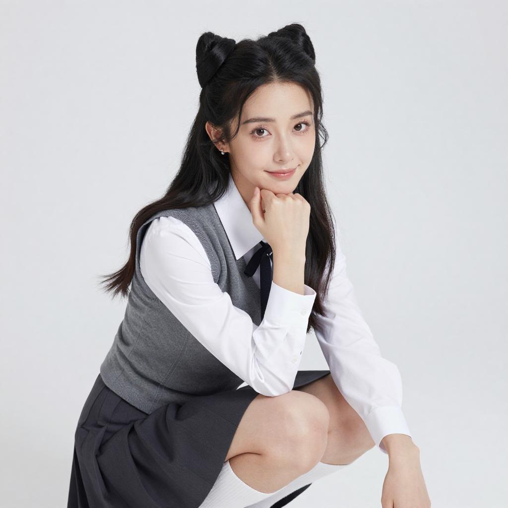 Photograph of an Asian woman with long, straight black hair in twin buns, wearing a white shirt with a black bow tie and gray sleeveless sweater. She holds a blue butterfly hairpin in her right hand, smiling softly. Bright white background.