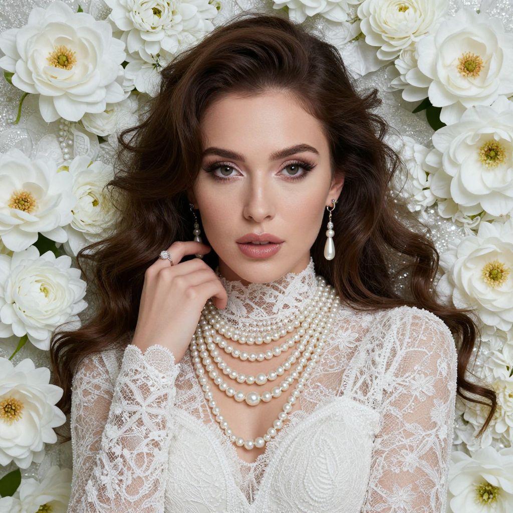 Photograph of a fair-skinned woman with long, wavy dark brown hair, wearing a white lace top with intricate floral patterns. She is adorned with multiple layers of pearl necklaces and dangling teardrop earrings. Her makeup is subtle, with defined eyebrows and nude lipstick. She gazes directly at the camera with a slightly parted lip. The background is filled with large, white, fully-bloomed flowers with yellow centers, creating a romantic and elegant atmosphere. The lace texture contrasts with the smoothness of the pearls and the soft petals, enhancing the image's delicate and luxurious feel.