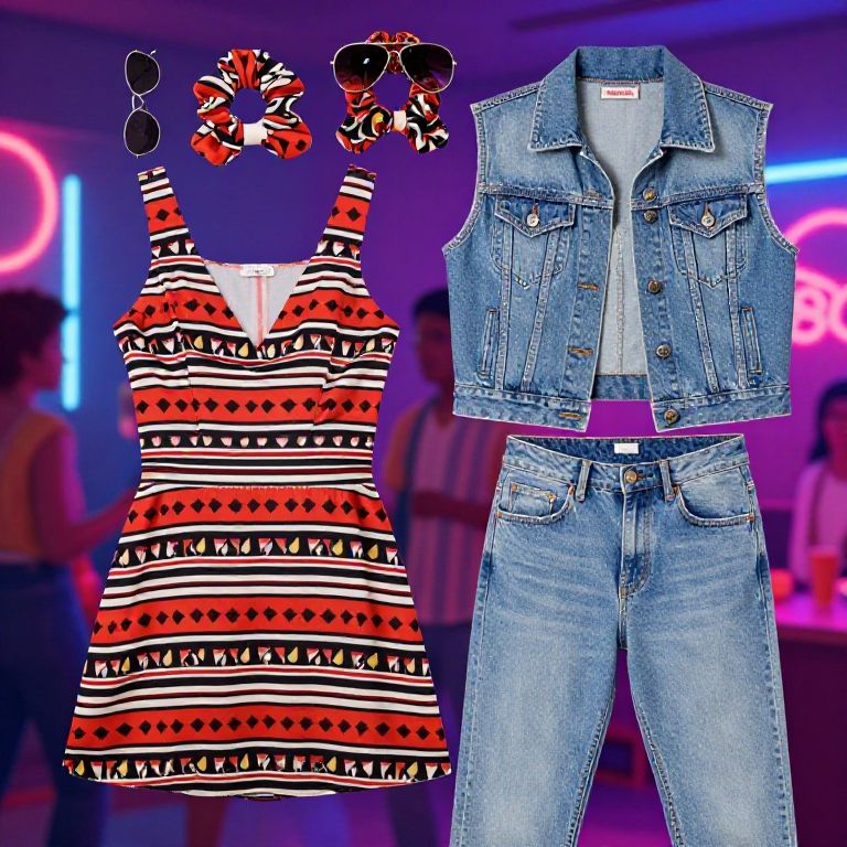This digital collage showcases a vibrant fashion ensemble. The central elements are a sleeveless, red, white, and black striped dress with geometric patterns, paired with a blue denim vest and matching blue jeans. Above the dress, a pair of black and red patterned sunglasses with heart-shaped lenses is displayed. The background features a blurred, neon-lit nightclub scene with pink and blue lights, and indistinct figures, adding a lively, party atmosphere. The image uses bright, contrasting colors and sharp textures to highlight the casual yet stylish outfit.