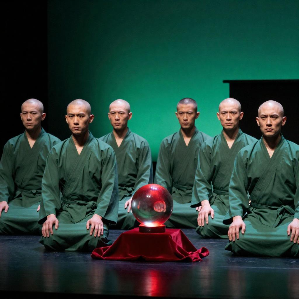 Six bald men in green robes sitting in a row on a dark stage, hands on knees, intense expressions. Central red-lit glass orb on red cloth. Green-lit background, right side partially visible screen.