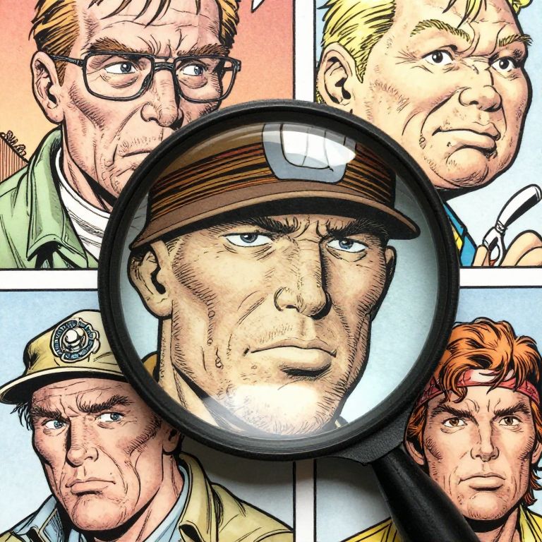 Comic-style illustration of six serious-faced men, one in a magnifying glass center, diverse ages, backgrounds, and expressions, in a grid layout.