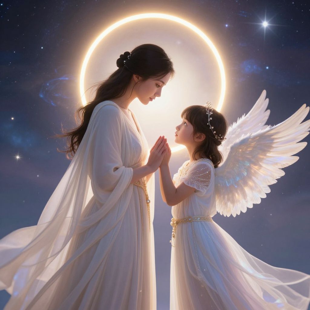 A radiant halo illuminates a tender moment between a woman draped in flowing robes and a child adorned with ethereal wings, their hands clasped in a mystical bond against a celestial backdrop.