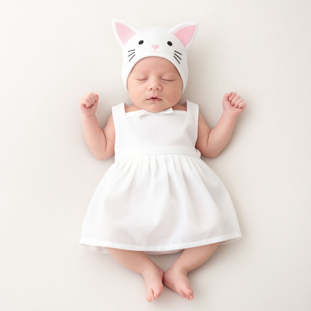 Photograph of a sleeping baby with light skin, wearing a white sleeveless dress and a white cat-eared hat with pink ears and black whiskers. The baby's eyes are closed, and their arms are slightly raised. The background is pure white, making the baby the central focus. The baby's small feet are visible at the bottom of the image, and their hands are relaxed. The overall aesthetic is clean and minimalistic, with a soft, innocent feel.