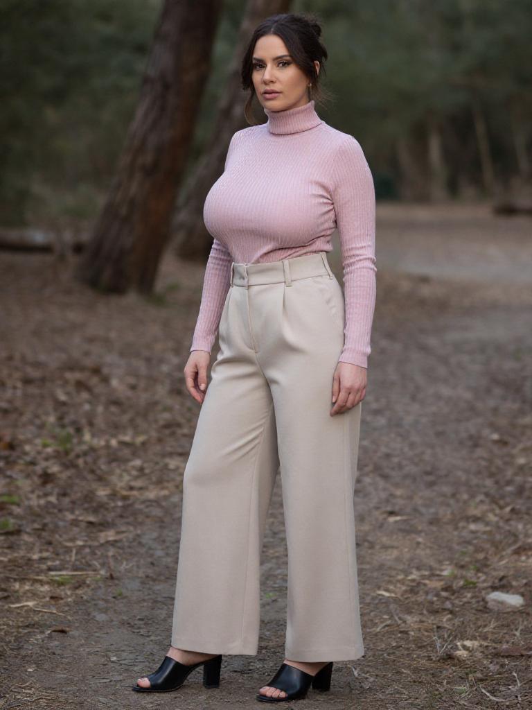 A Pear-shaped body type woman, styled in a Cibachrome visual aesthetic, wearing a pale pink ribbed turtleneck and high-rise wide-leg beige trousers, stands in a woodland clearing with a stone path, minimal makeup, hair in a casual updo, and open-toe black mules with block heels. Sexy. Pretty face and beаutiful eyes. Big breasts